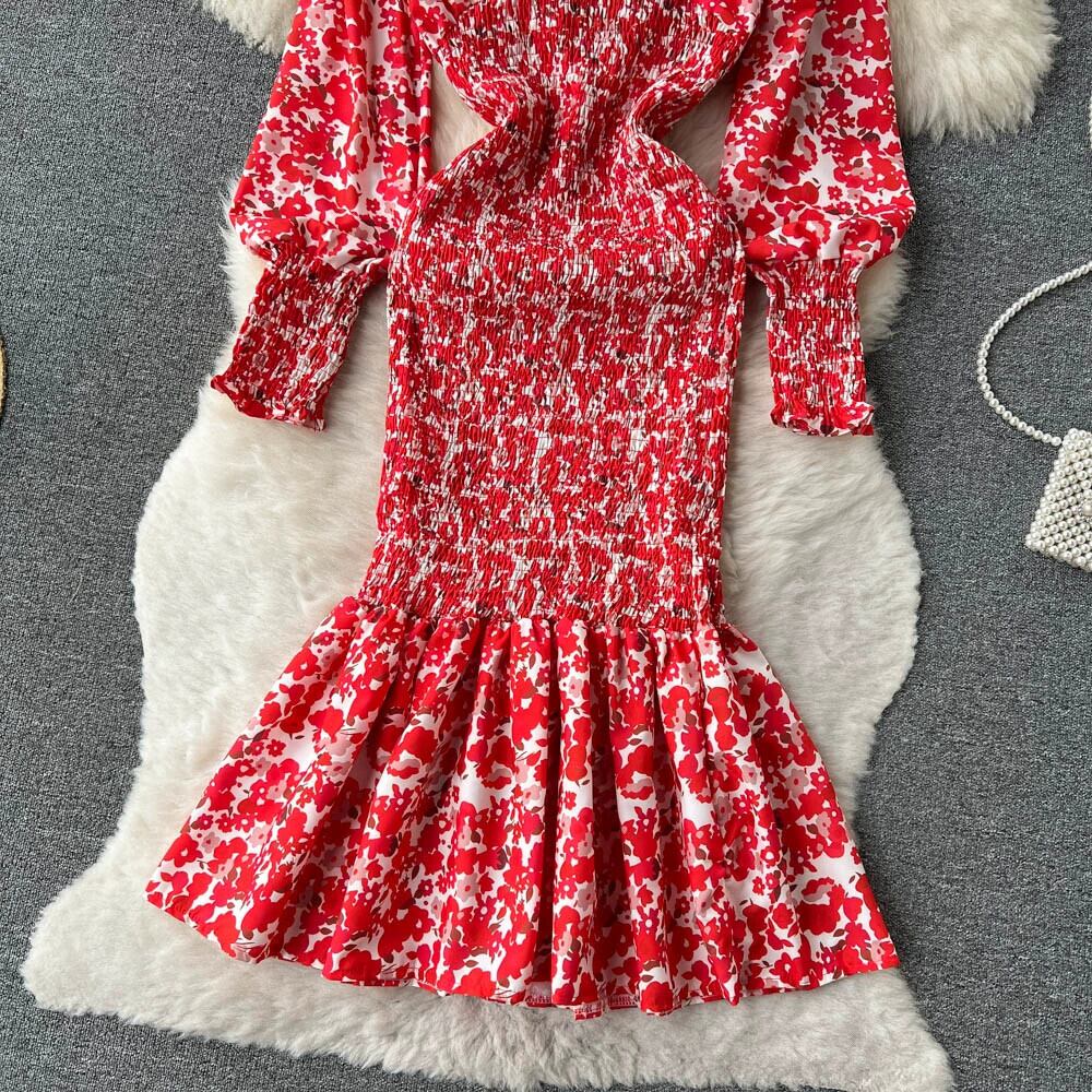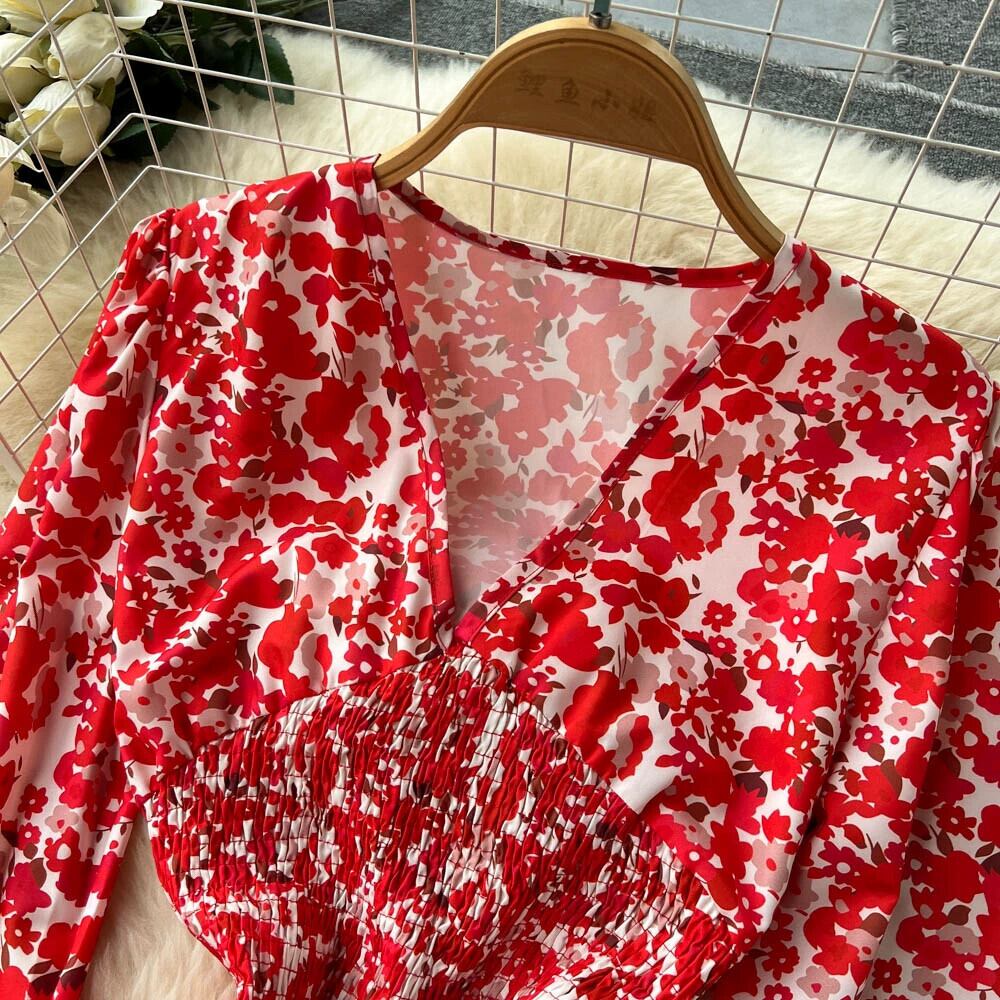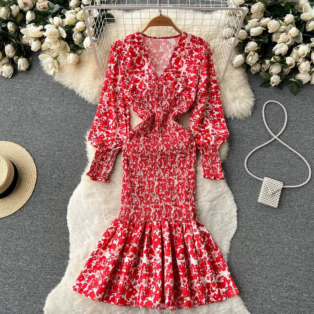 春と秋の気質 V ネックプリントフィッシュテールドレス女性のフレンチレトロ花柄ウエストカバーヒップロングスカートトレンディ スプリング 春物 オータム 秋物 Vネック jie15077232278