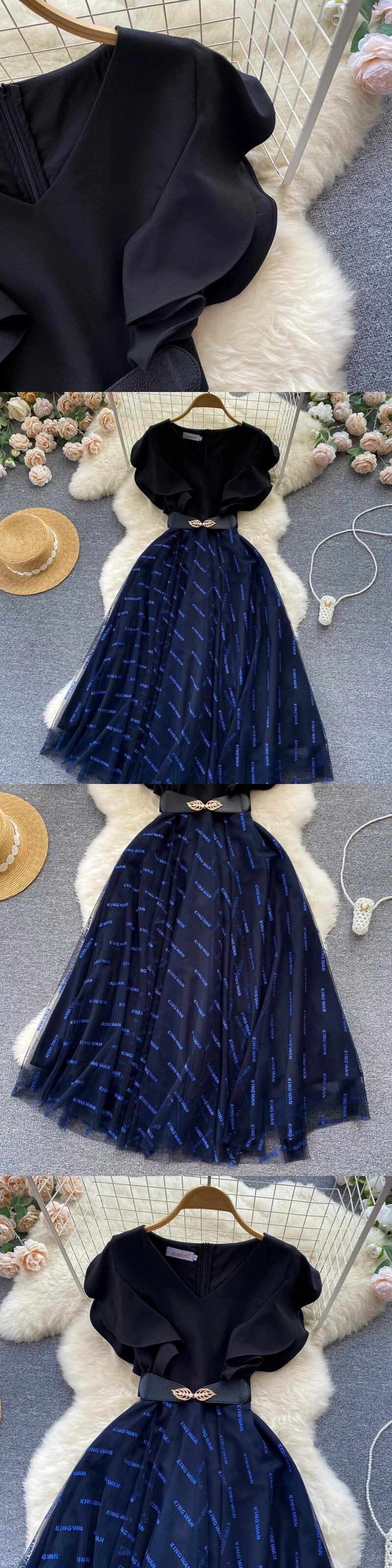 -end、軽くて洗練されたスタイル、ウエストを細くする、コントラストのあるプリントのVネックドレス、夏の女性用フリルロングスカート サマー 夏物 jie62110947828