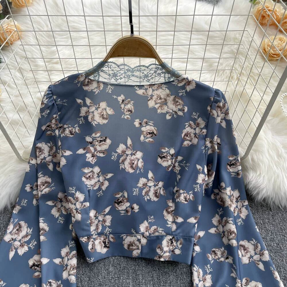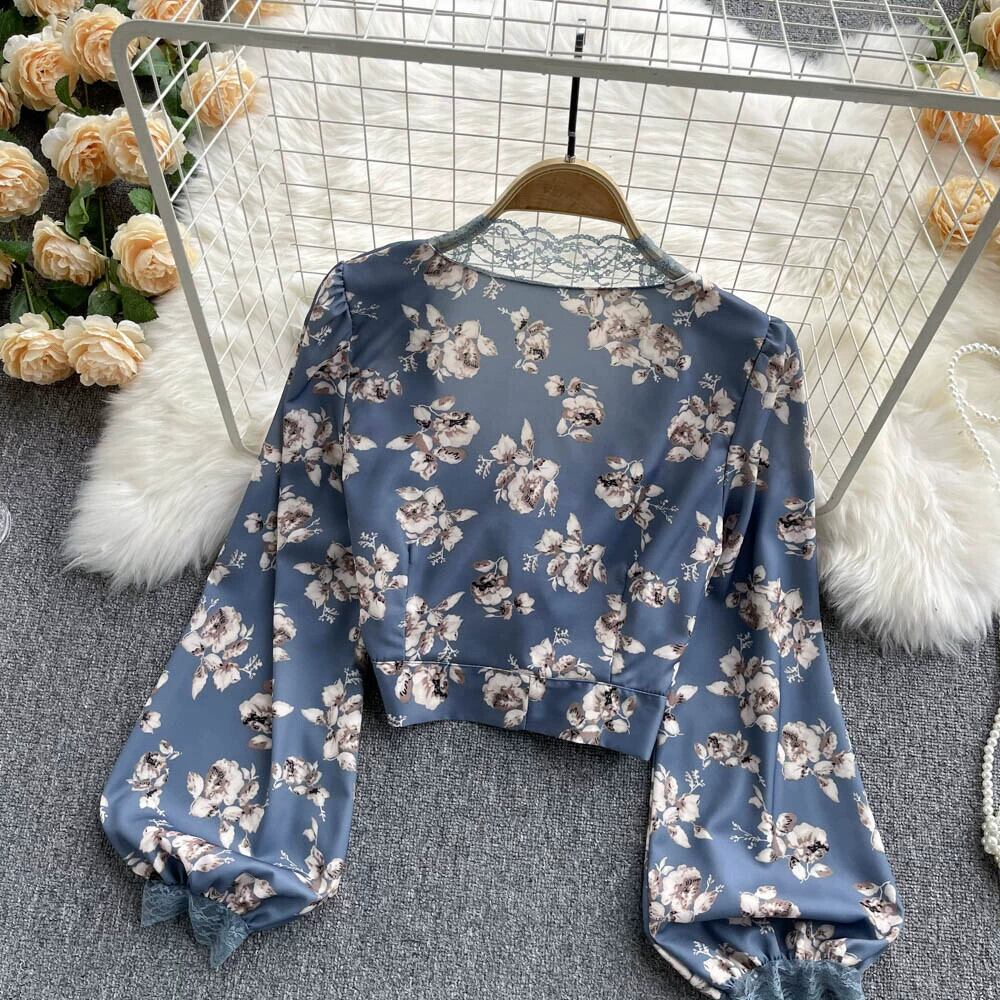 フレンチレースエッジVネック花柄シャツ女性ニッチデザインレトロストラップウエストショート気質トップトレンディ jie78694486667
