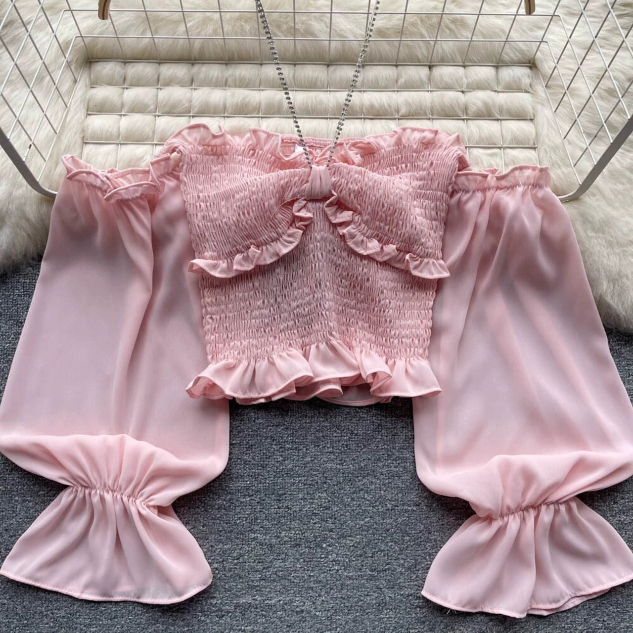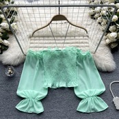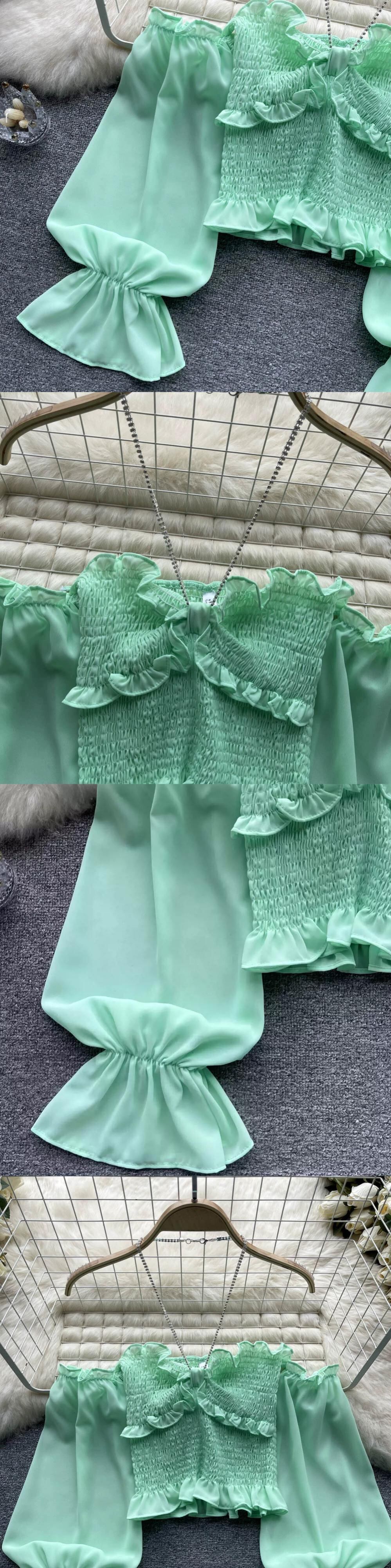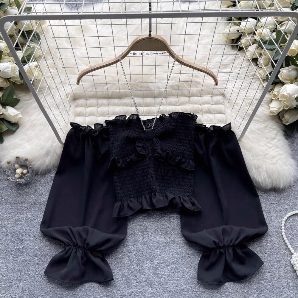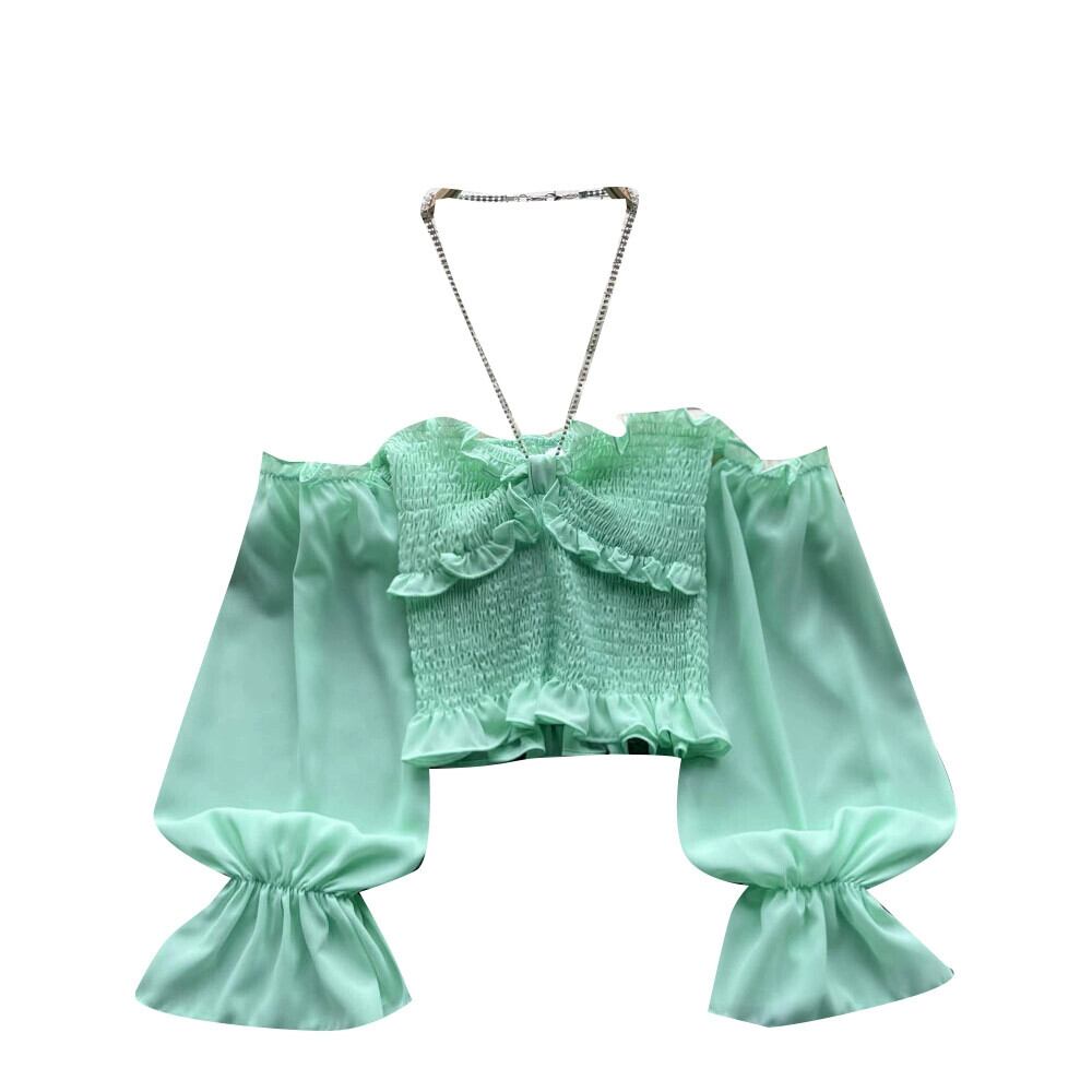 ワンショルダー チェーン ストラップ ストラップレス シフォン トップ レディース スリム ショート フレンチ デザイン ニッチ パフ スリーブ シャツ jie57446337151