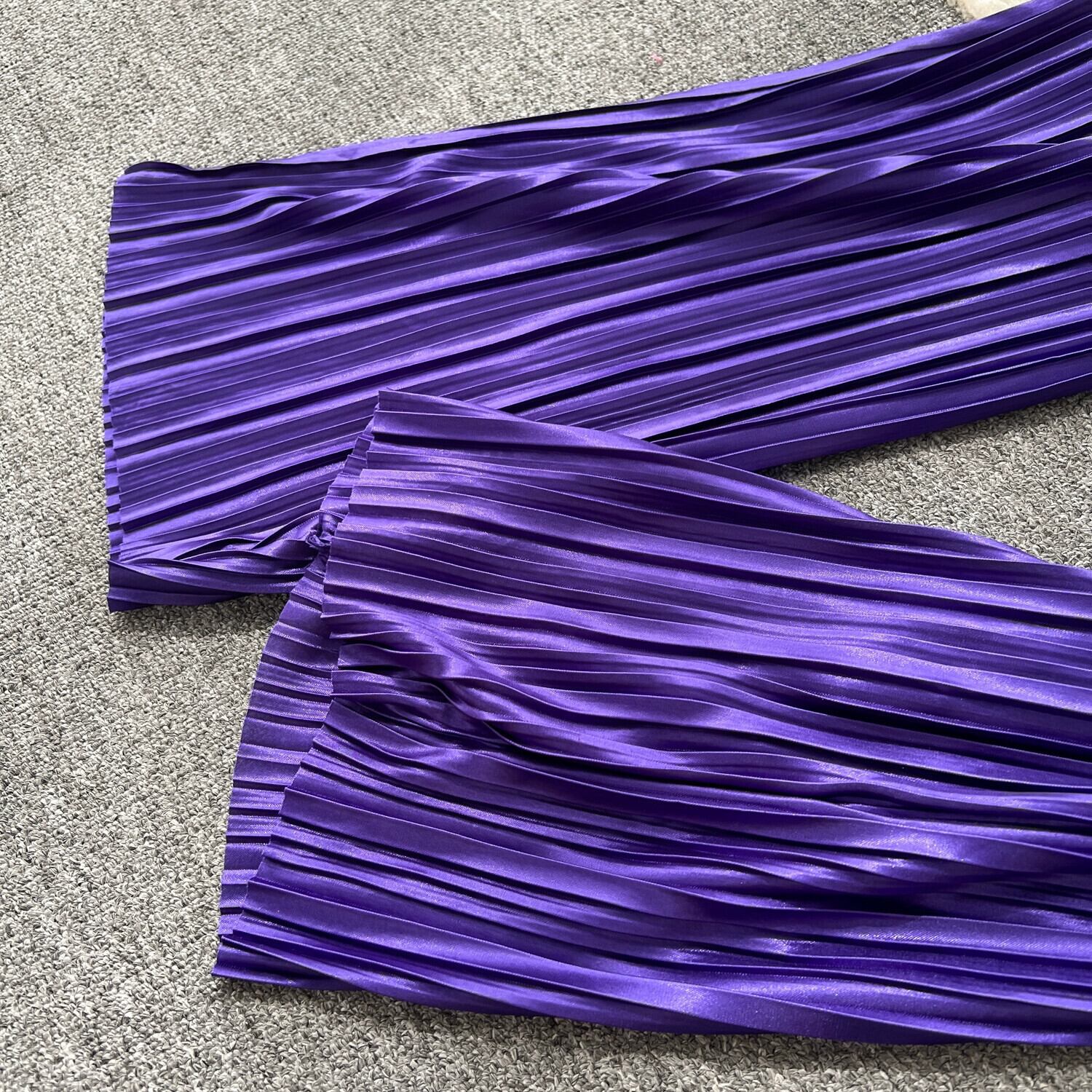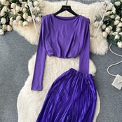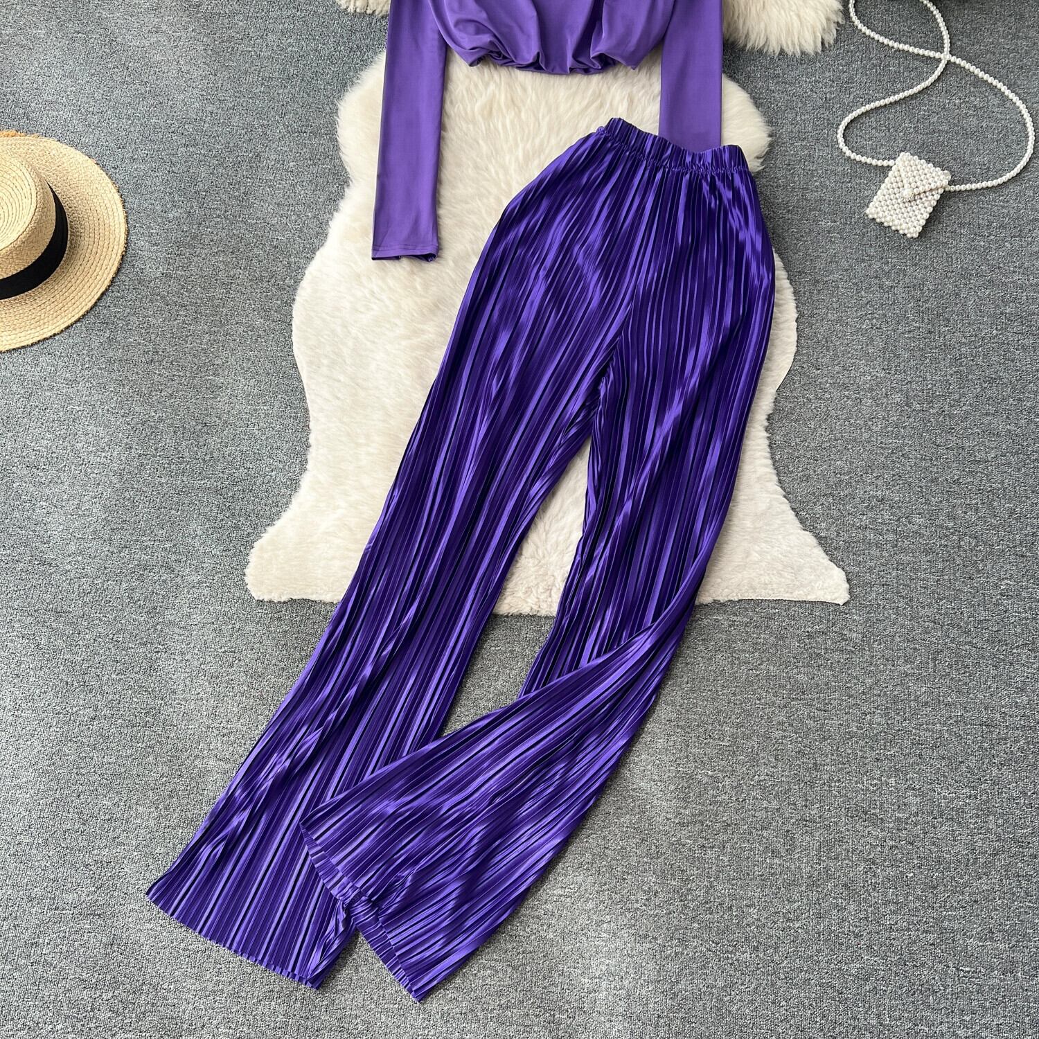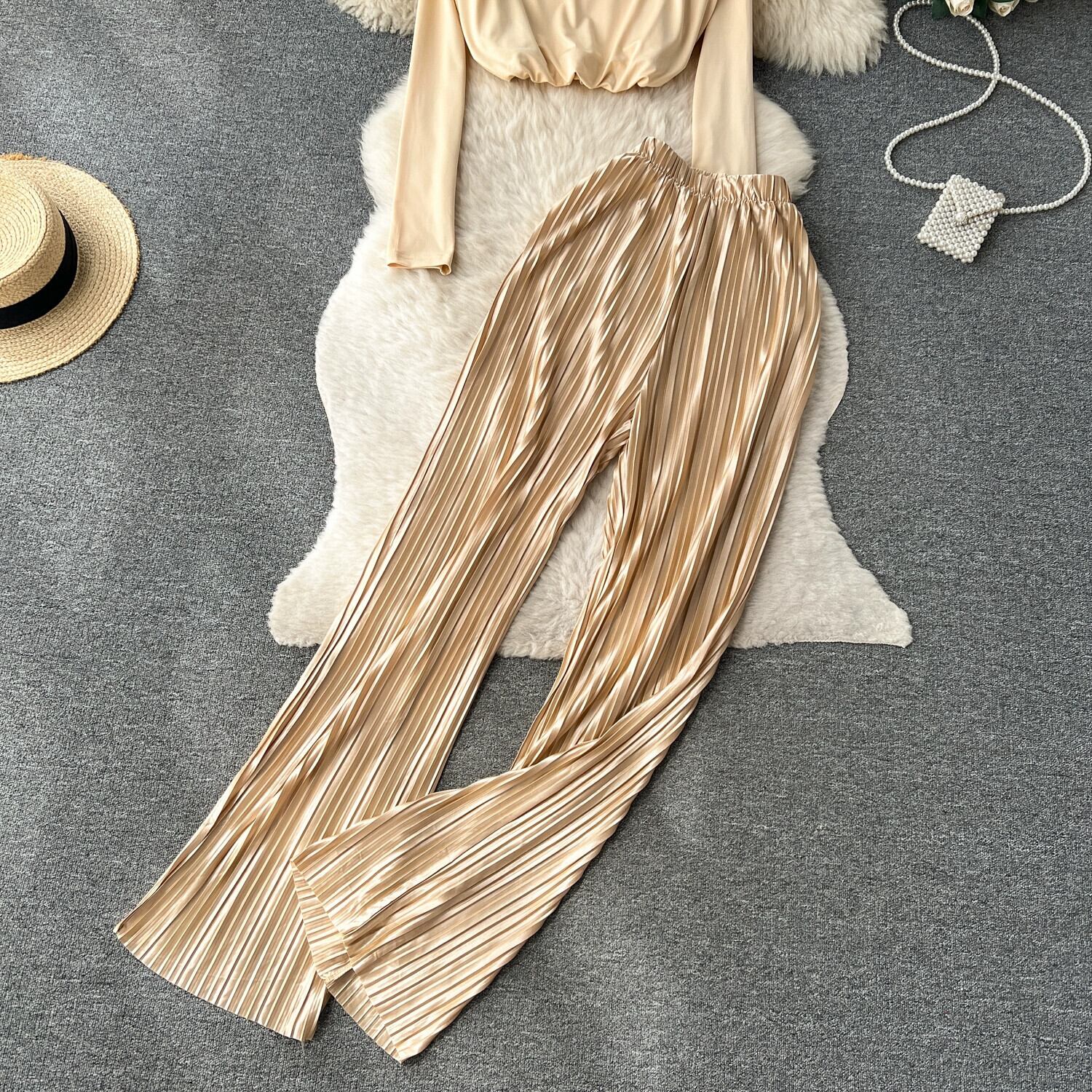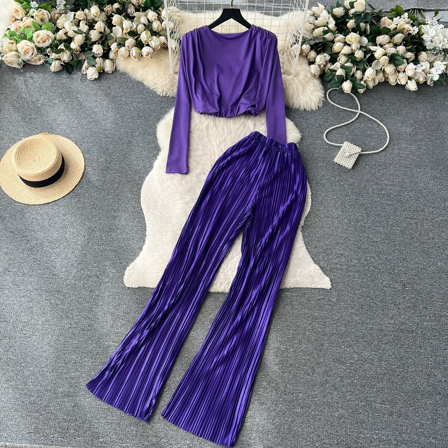 欧米ファッションセットレディース、ラウンドネック、長袖、ショートクロップトップ+ハイウエストスリムプリーツワイドレッグパンツ2点セット ロング Oネック ヨーロピアン jie76771246735