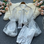2023 初秋の新スタイルスーパーフェアリー蝶ネクタイパフスリーブレースシフォンシャツメッシュ刺繍中空トップ レッド リボン オータム 秋物 jie78446976695