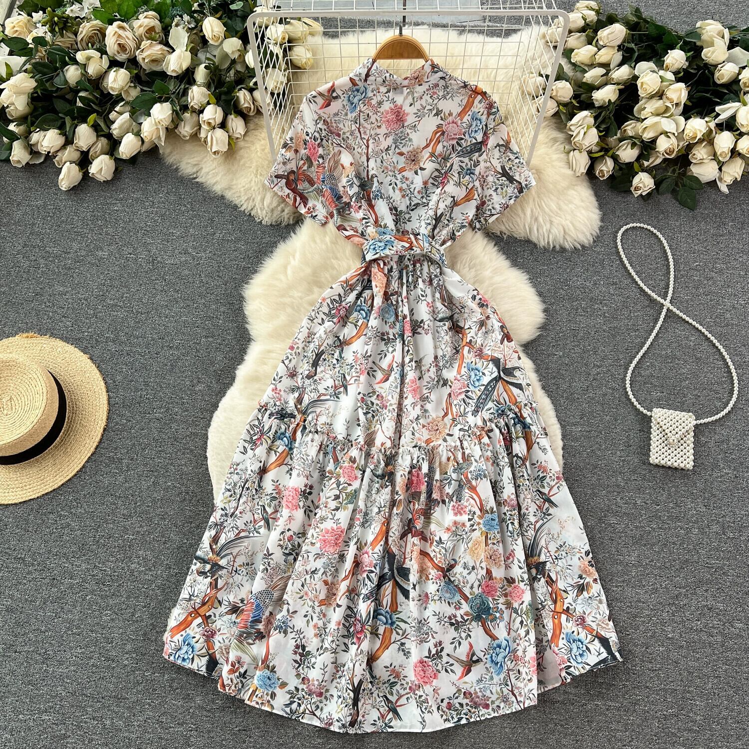 ニッチデザインのハイエンドシャツドレスレディース夏半袖ウエスト花柄大きな裾ミッドレングスエレガントスカート サマー 夏物 jie30814134910