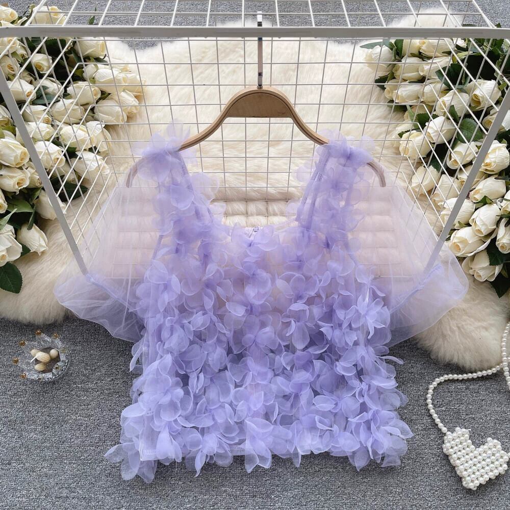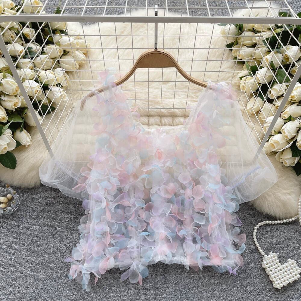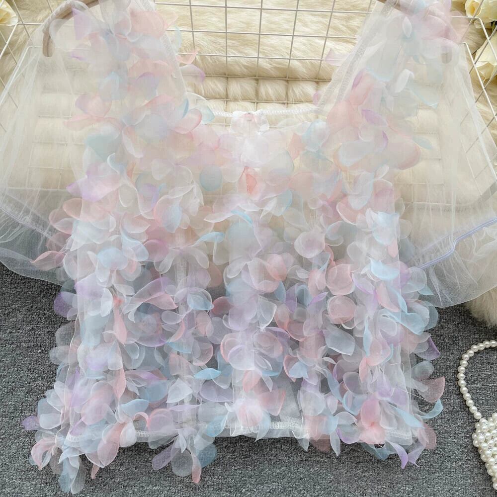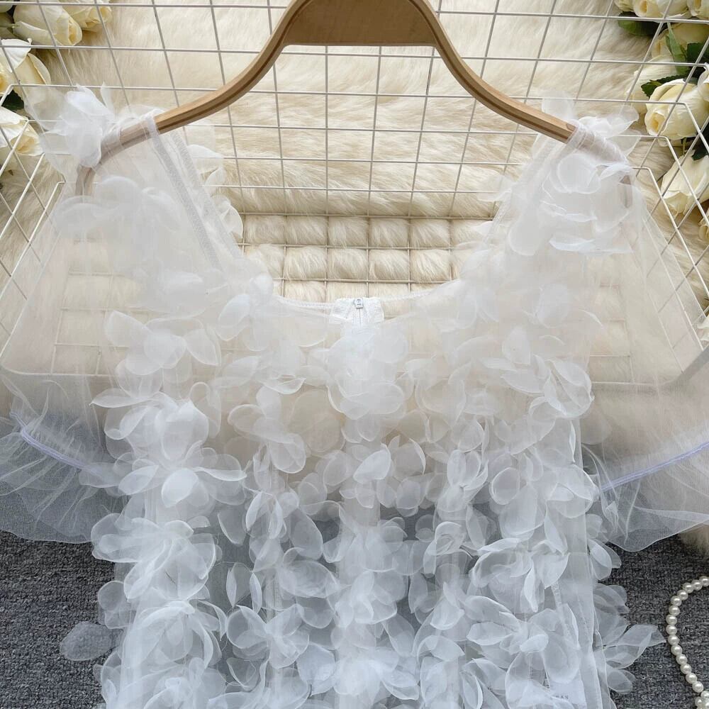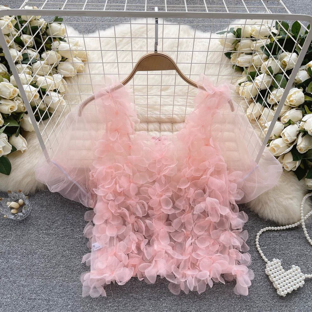フレンチレトロスタイルメッシュ立体花びらシャツ女性の夏のパフスリーブ甘くて独特な雰囲気のショートシャツ 大人ガーリー スウィート キュート カジュアル サマー 夏物 jie3693610072