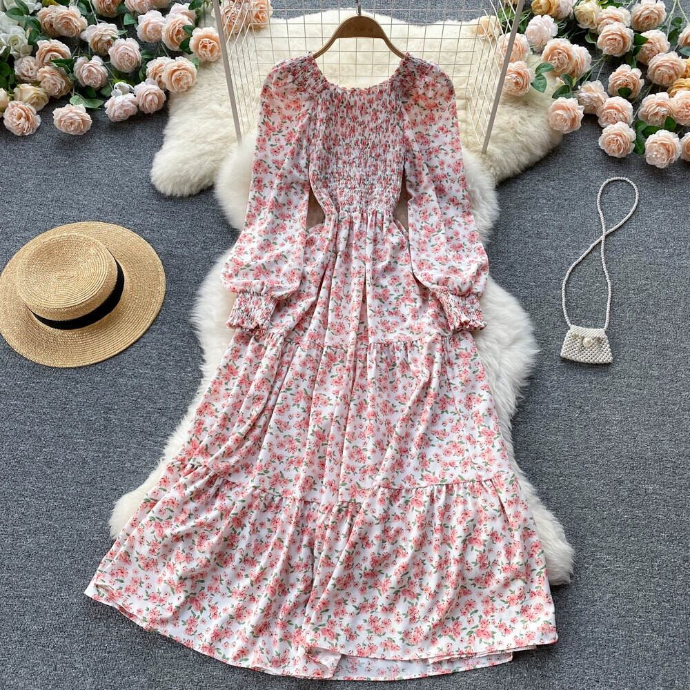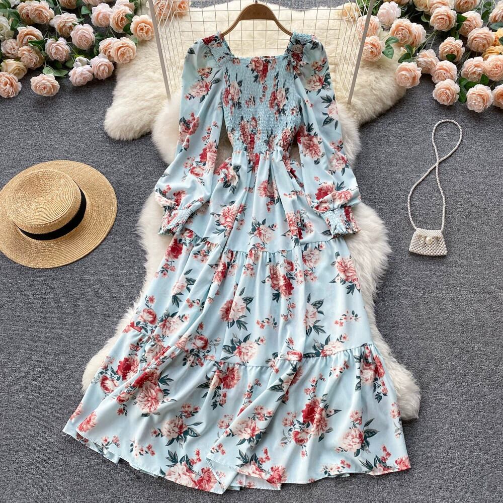 甘くて優しいスタイルのフランスの花柄ドレスの女性、ウエストカバー、お腹を小さくする、年齢を減らす気質、四角い襟、スーパーフェアリーロングスカート 大人ガーリー スウィート キュート カジュアル スクウェア jie1549719352