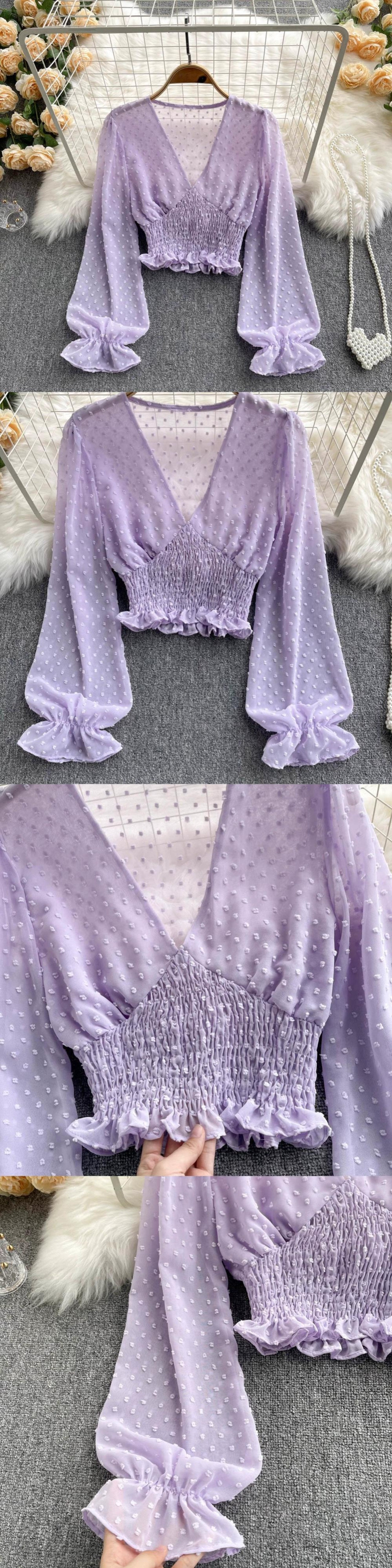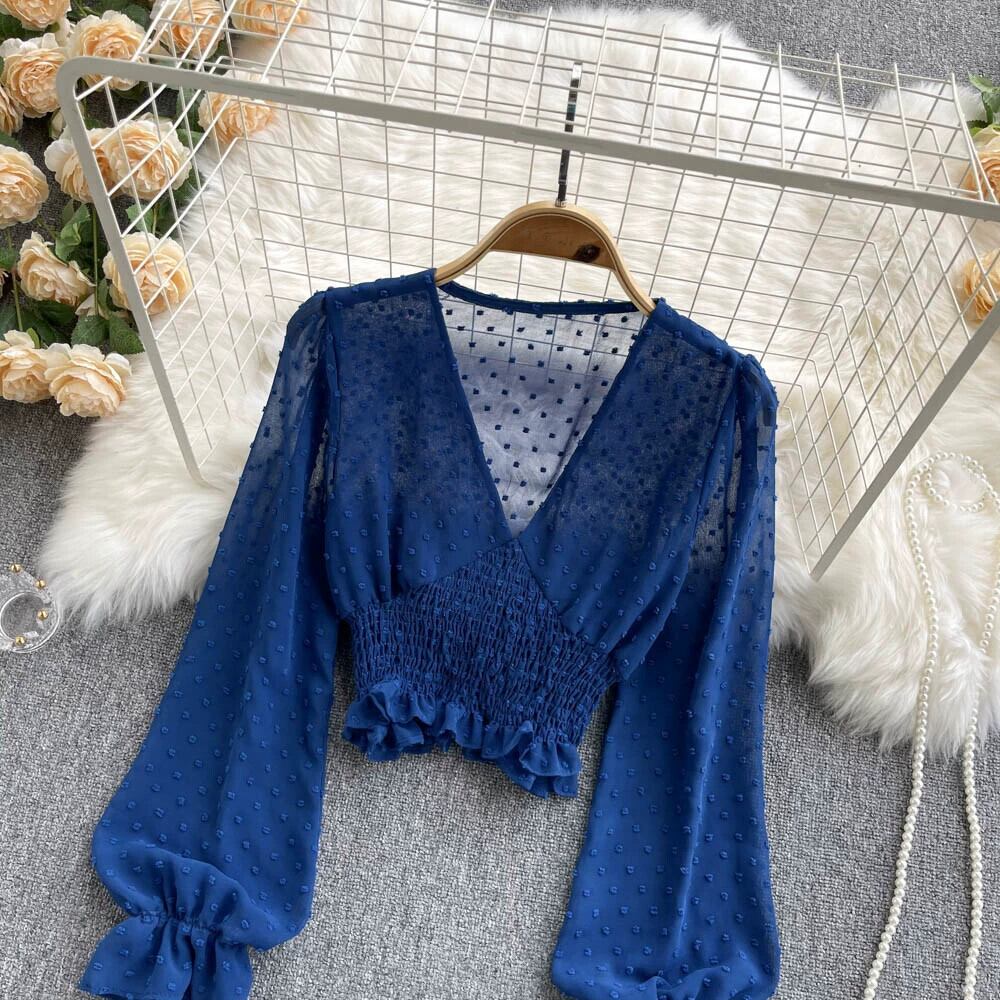 スタイル気質 V ネック菌スリムショートパフスリーブシャツレディースデザインニッチスキーミングシースルートップ Vネック jie18722032791