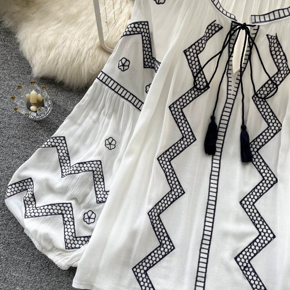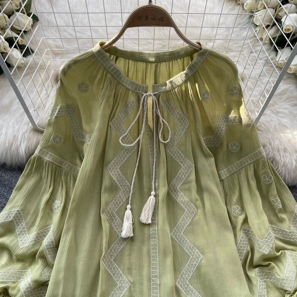 フランスのヨーロッパとアメリカのスタイルのプリントラウンドネックシャツ、春と秋の女性、ランタンスリーブデザインのニッチなルーズでスリムなベビードールシャツ スプリング 春物 オータム 秋物 Oネック ヨーロピアン jie51008170732