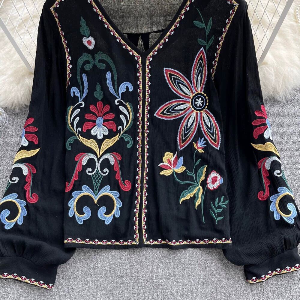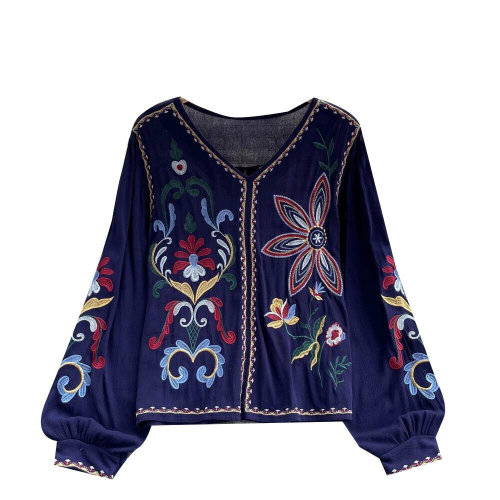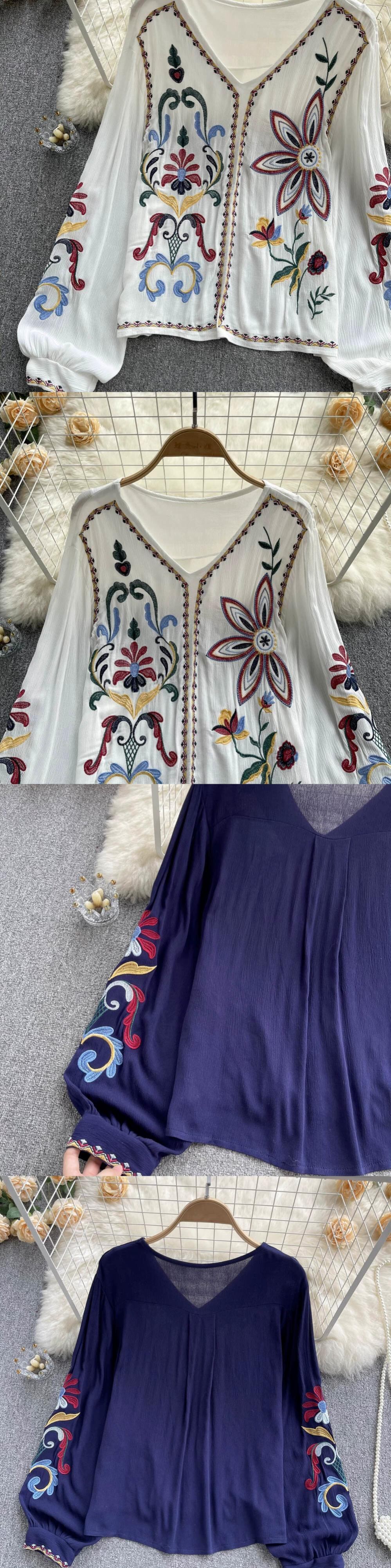 レトロ重工業刺繍トップス女性 2022 春と秋の新 V ネックルーズランタン袖エスニックスタイルの綿とリネンのシャツトレンディ レッド ランタンスリーブ コットン スプリング 春物 オータム 秋物 Vネック jie41773061048