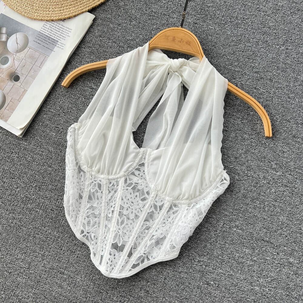 夏フレンチホルターネックストラップシフォンステッチ中空メッシュレースネクタイセクシーなチューブトップショートベストトップ サマー 夏物 jie90196401337