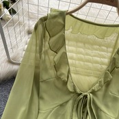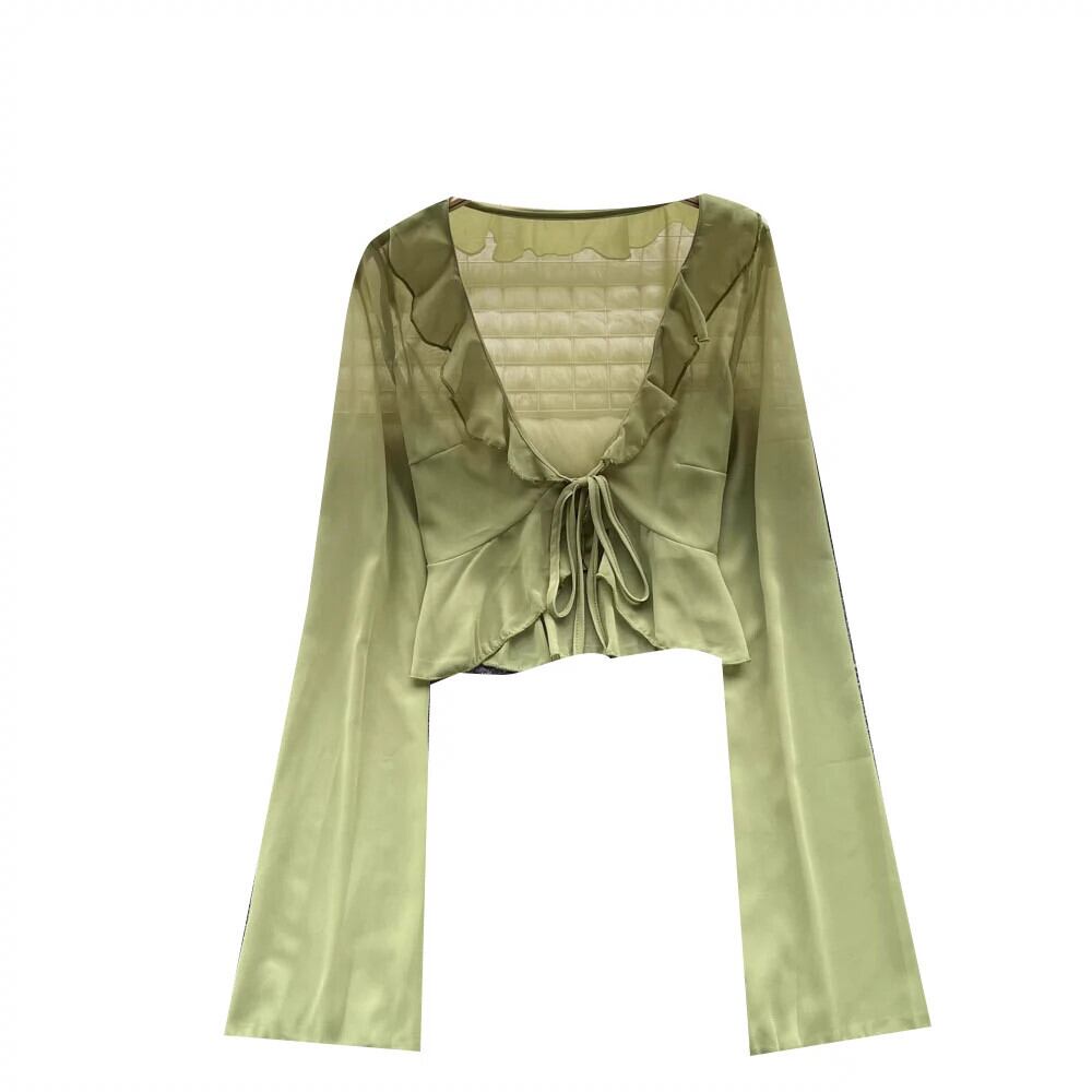 春と秋の新デザイン不規則なフリル V ネック長袖 T シャツレディーススキーミング巾着ショートシフォントップ ロング スプリング 春物 オータム 秋物 Vネック Tシャツ jie7890427456
