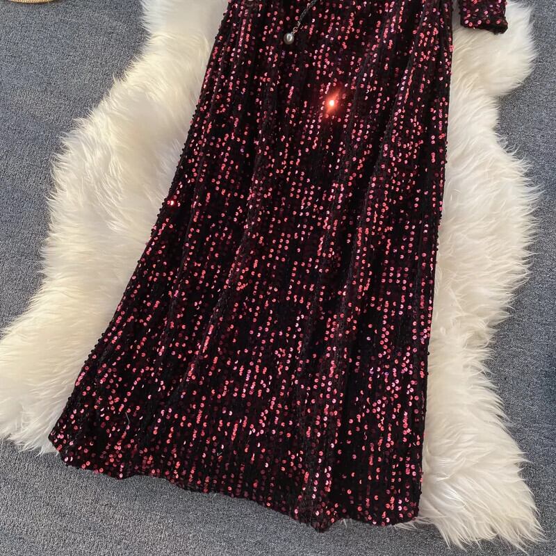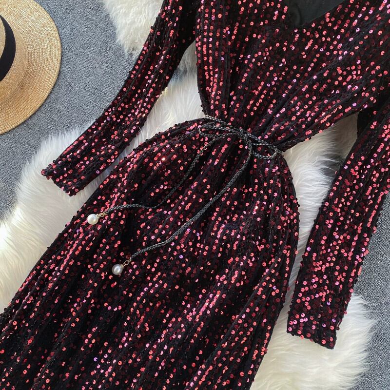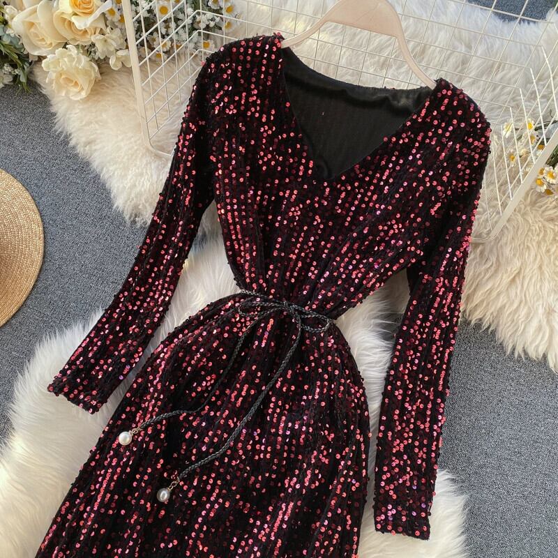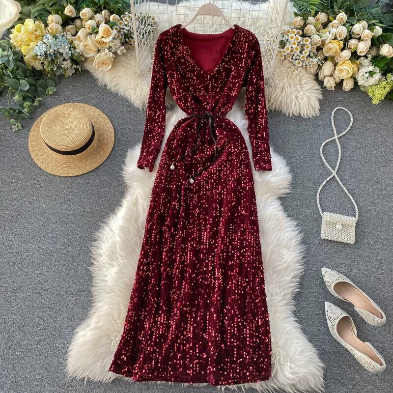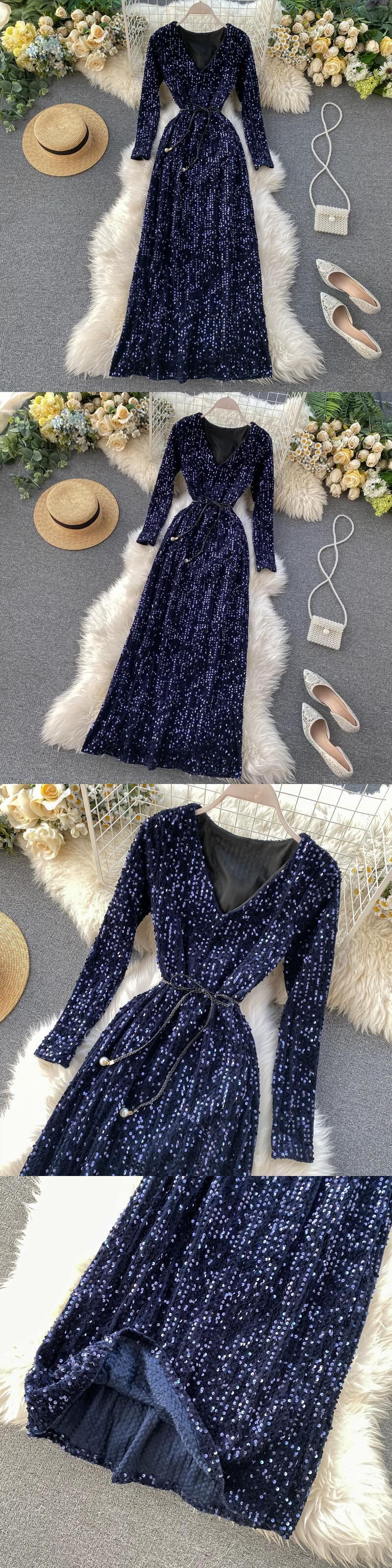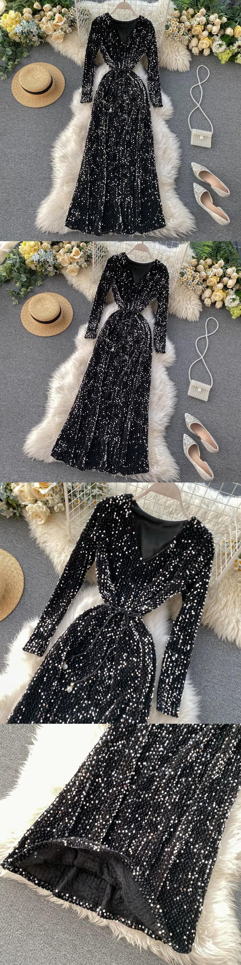 2020 ヨーロッパとアメリカスタイルの輝くスパンコールドレス V ネック長袖ウエスト痩身年次会議宴会エレガントなロングドレス Vネック ヨーロピアン jie1126188189