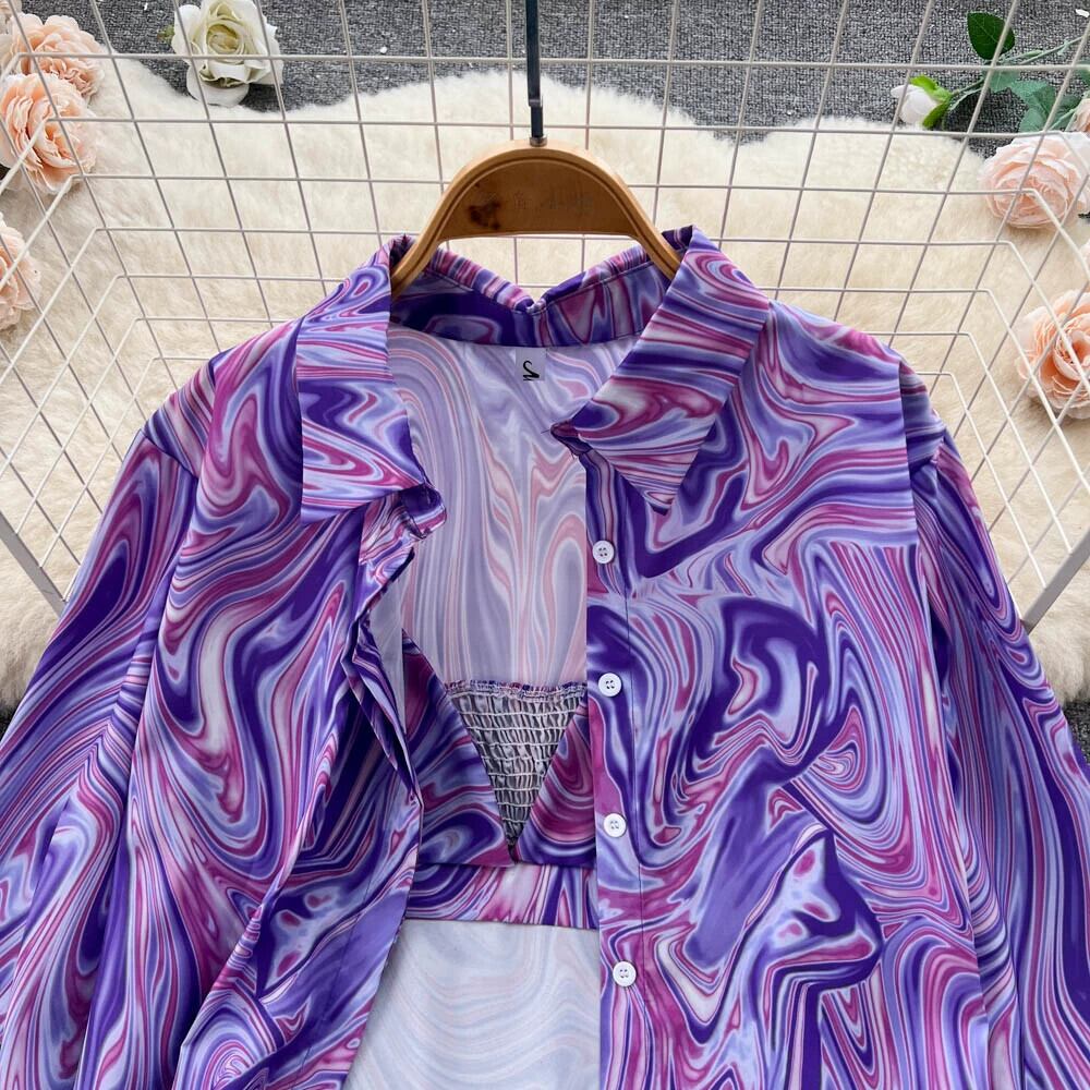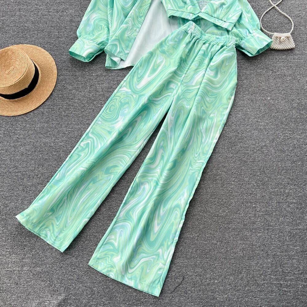 エスニック風秋レディース小さいキャミソールプリント長袖シャツトップスハイウエストワイドレッグロングパンツ3点セット ハイウェスト オータム 秋物 ワイドパンツ jie15589058820