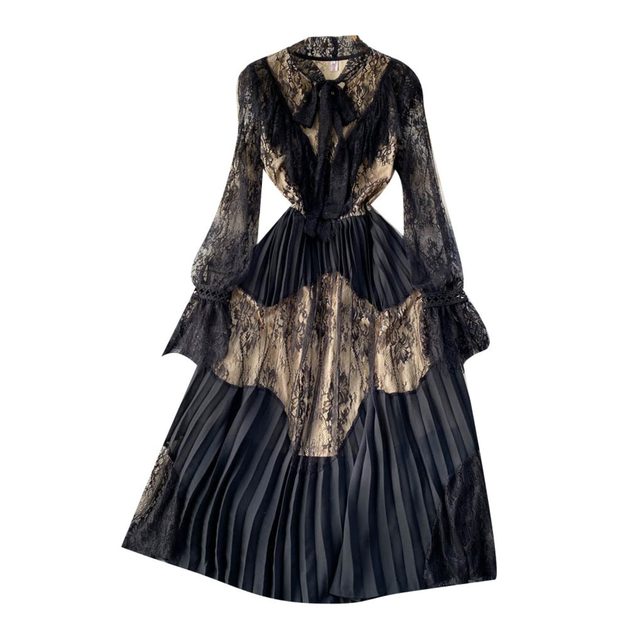2022 春スタイルランタンスリーブウエストメッシュレース中空スプライシング妖精ドレスプリーツスカート スプリング 春物 jie97319459636