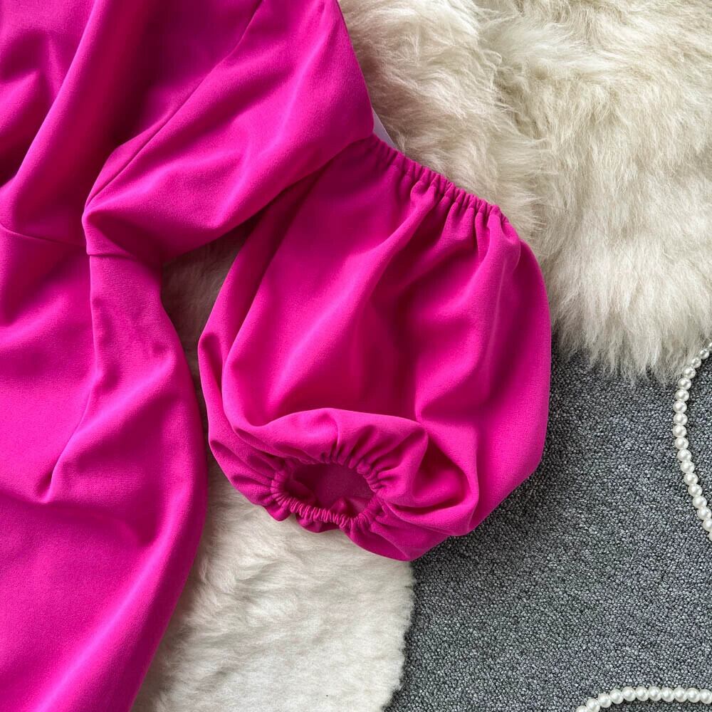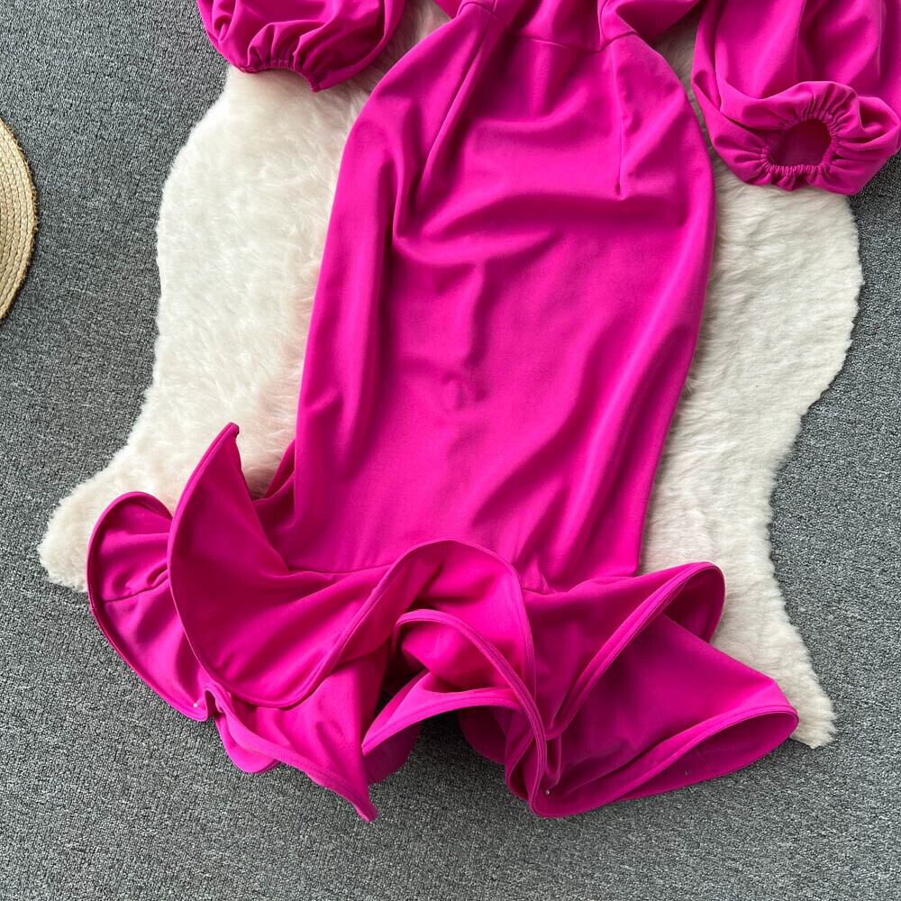 春夏のオフショルダーパフ半袖ワンラインカラーストラップレスヒップハグフリル裾エレガントな社交界のフィッシュテールドレス スプリング 春物 サマー 夏物 jie67357052103