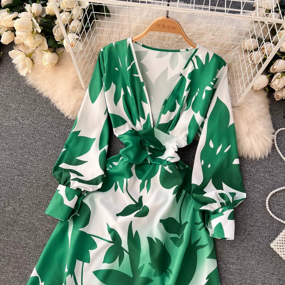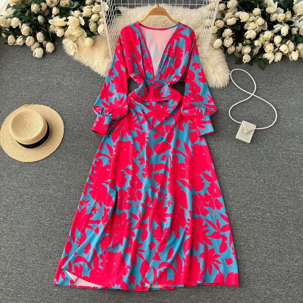 春と秋の新しいスタイルのヨーロッパとアメリカのインスタイルの深いVネックの休日スタイルのウエストを締めるプリントドレスの女性と膝上の大きなスイングのAラインロングスカート スプリング 春物 オータム 秋物 ヨーロピアン jie229965321