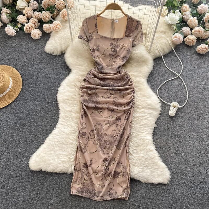 -エンド気質スクエアネックドレス夏の女性のフランスの美しい半袖プリントウエストスリットとヒップスカート サマー 夏物 スクウェア jie4407926702