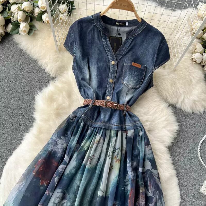 フェミニンでレディライクなVネックデニムパッチワークストラップウエストシフォンプリントワンピース裾たっぷりのエレガントなロングスカート jie29234534764