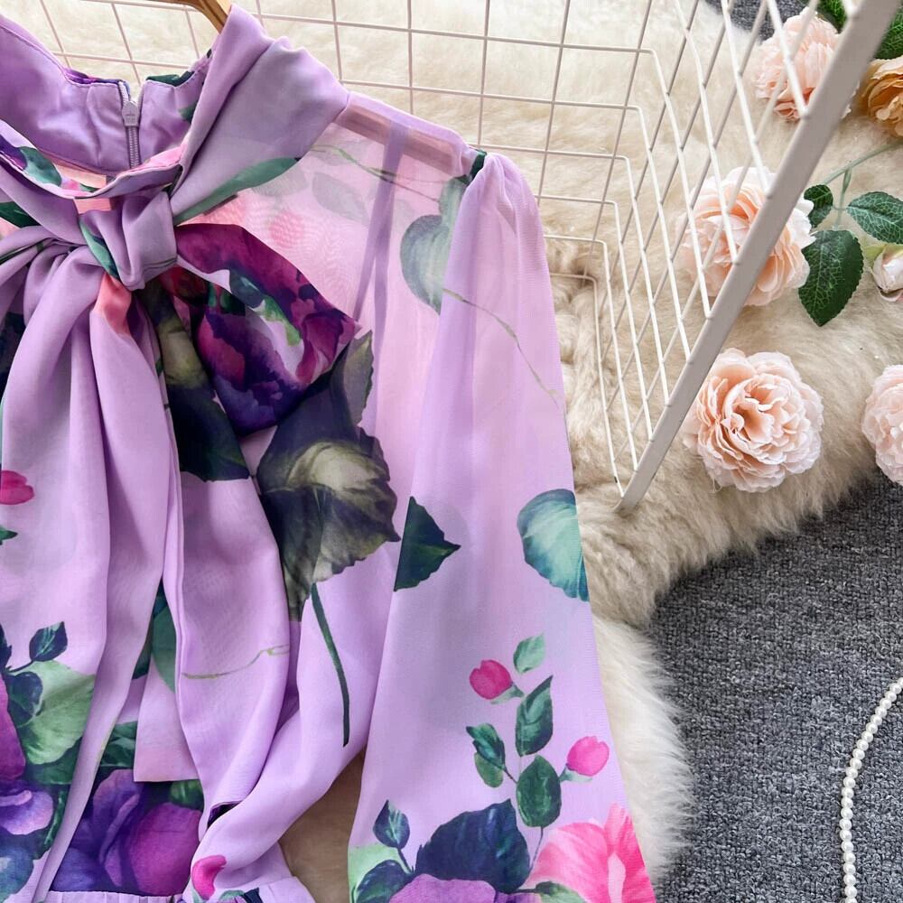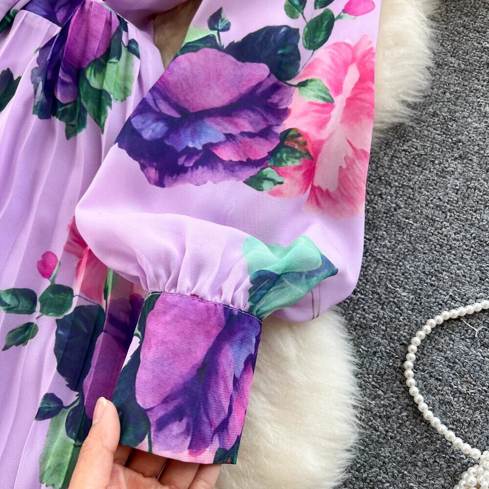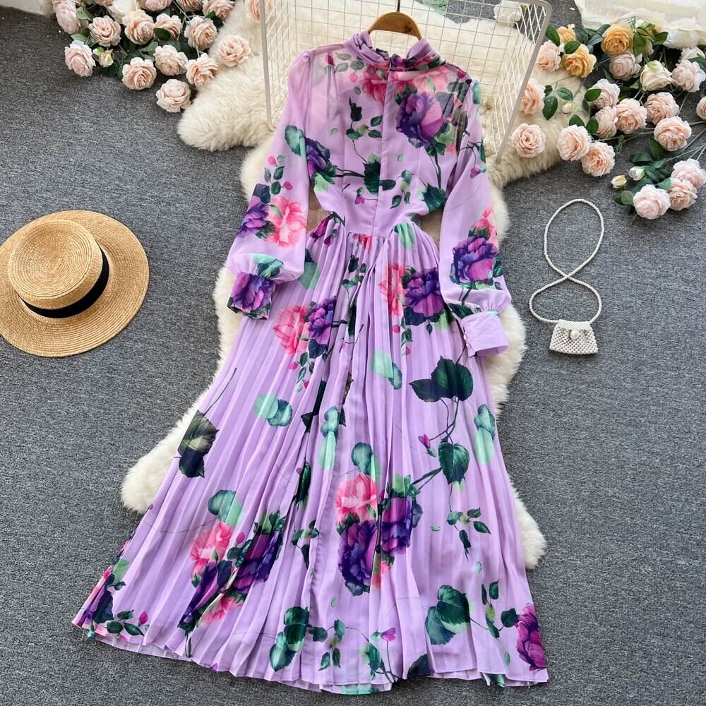 春と秋の新レトロエスニックスタイルニッチスカーフ襟花柄ロングスカート女性のウエストプリーツプリントロングスカートトレンディ スプリング 春物 オータム 秋物 jie23174667283