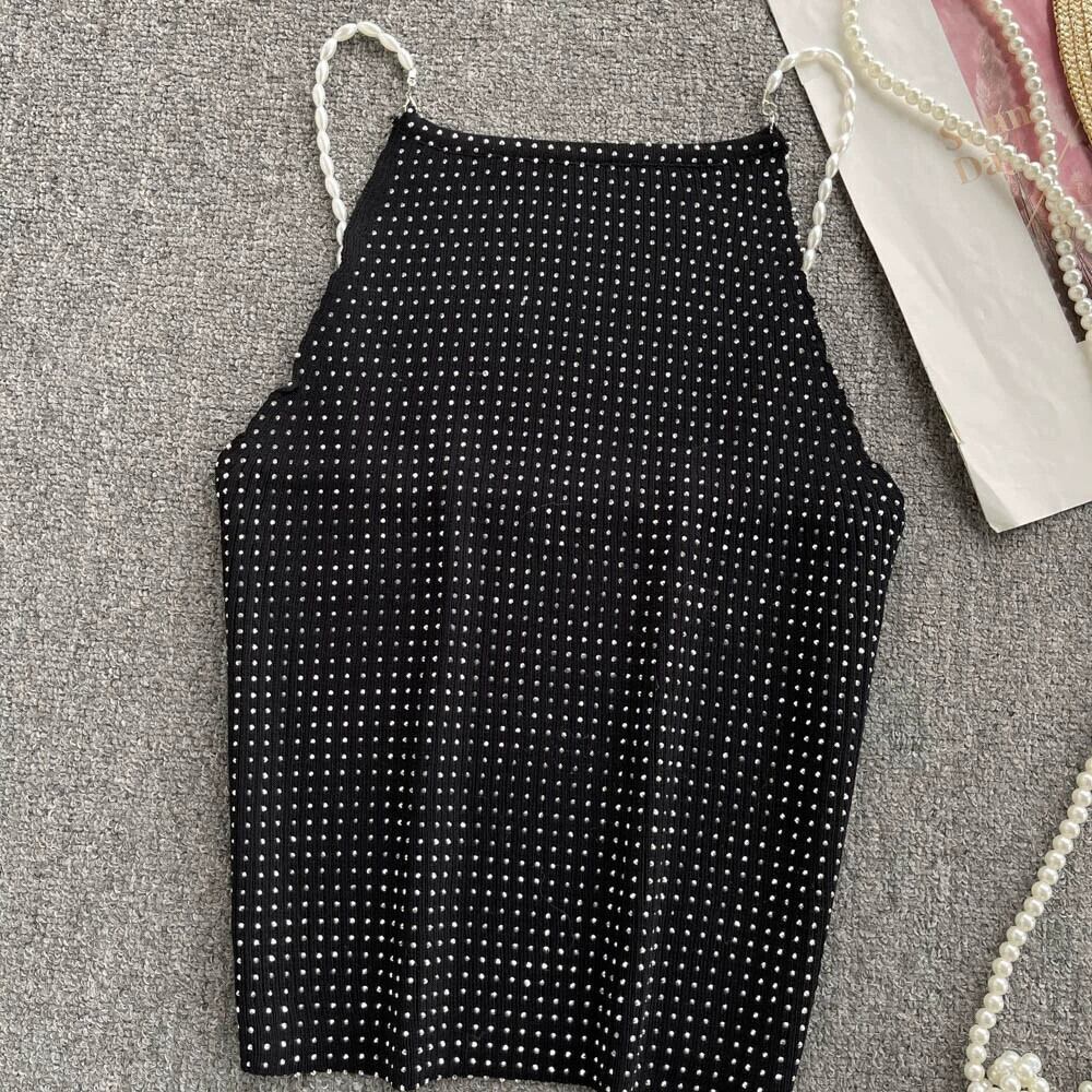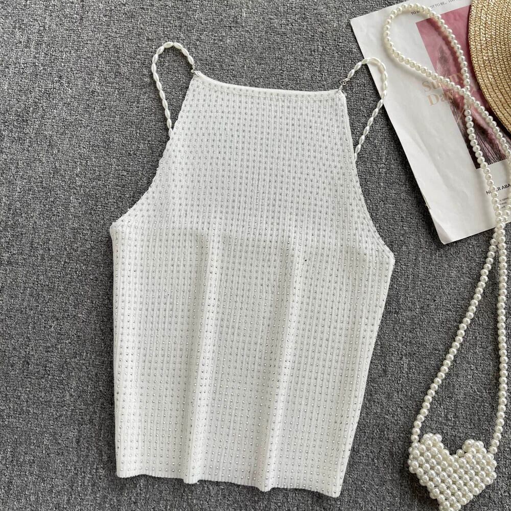 2022 夏ショートウエストビーズキャミソール背中の開いたノースリーブ甘いスパイシーなアウタートップ女性 大人ガーリー スウィート キュート カジュアル サマー 夏物 jie41585193940