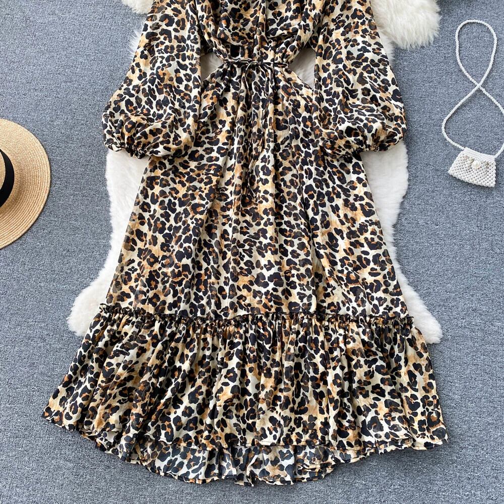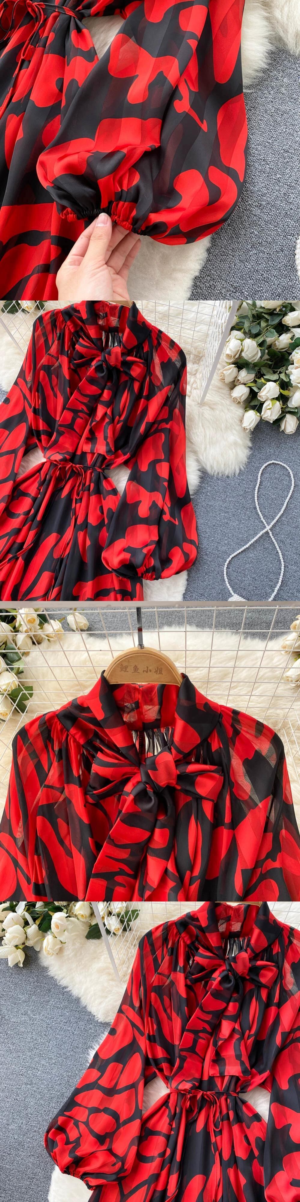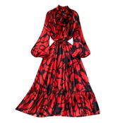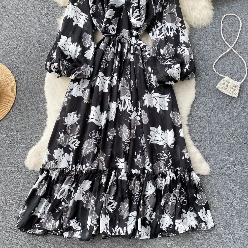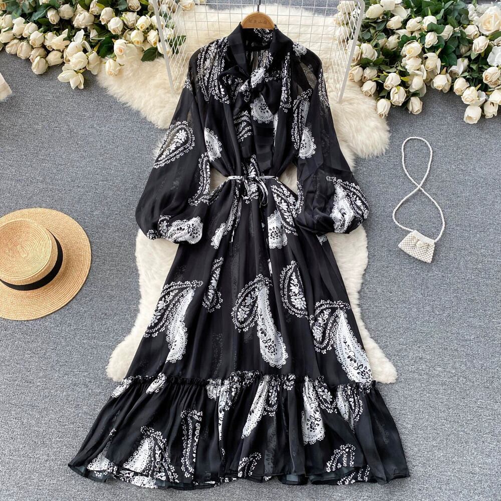 ヨーロッパとアメリカのスタイルのフランスのレトロなプリントのボヘミアン ロング スカート、大きな裾とフリル、プリーツ ルーズ ランタン スリーブ ドレス ランタンスリーブ ラッフル ヨーロピアン jie97147281813