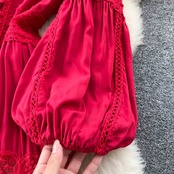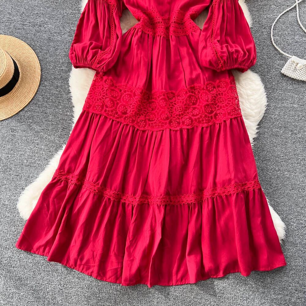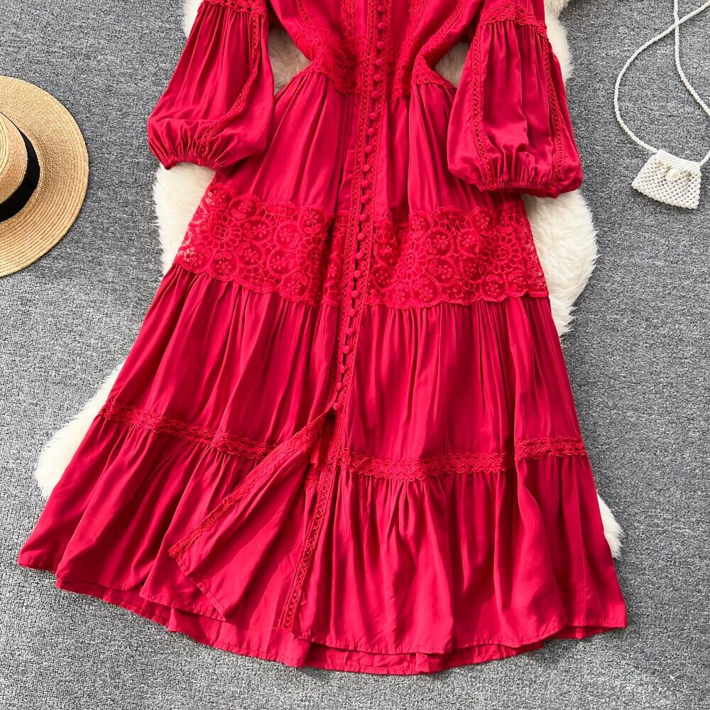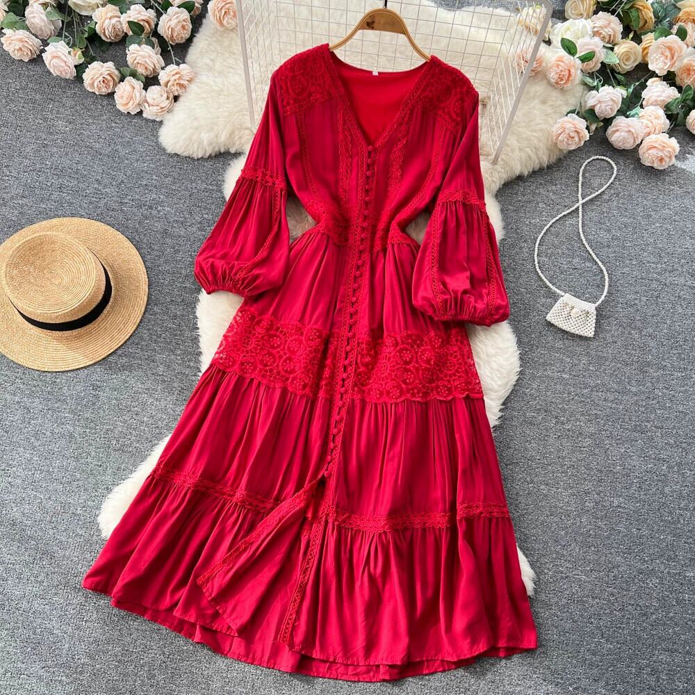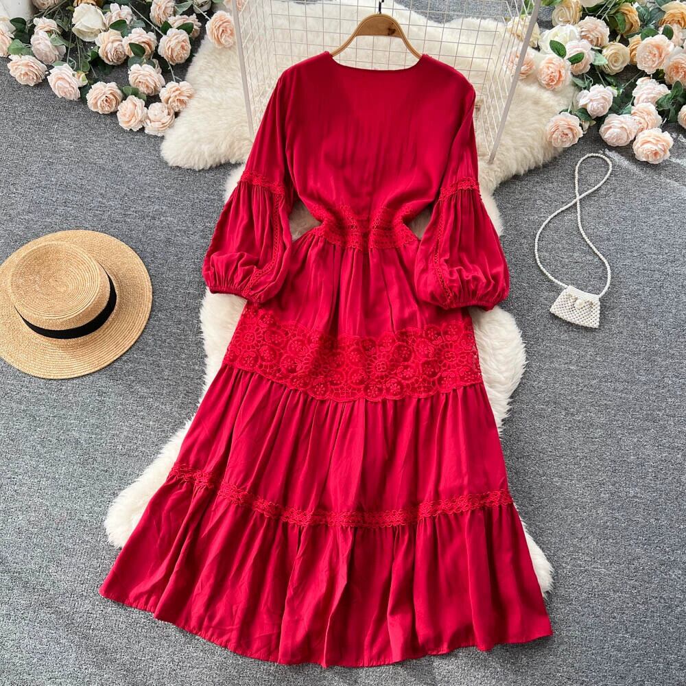 秋のパフスリーブフレンチレトロホリデーフェアリードレスロングスカート優しいスーパーフェアリーウエスト痩身宮殿スタイルドレス レース オータム 秋物 jie58071190674
