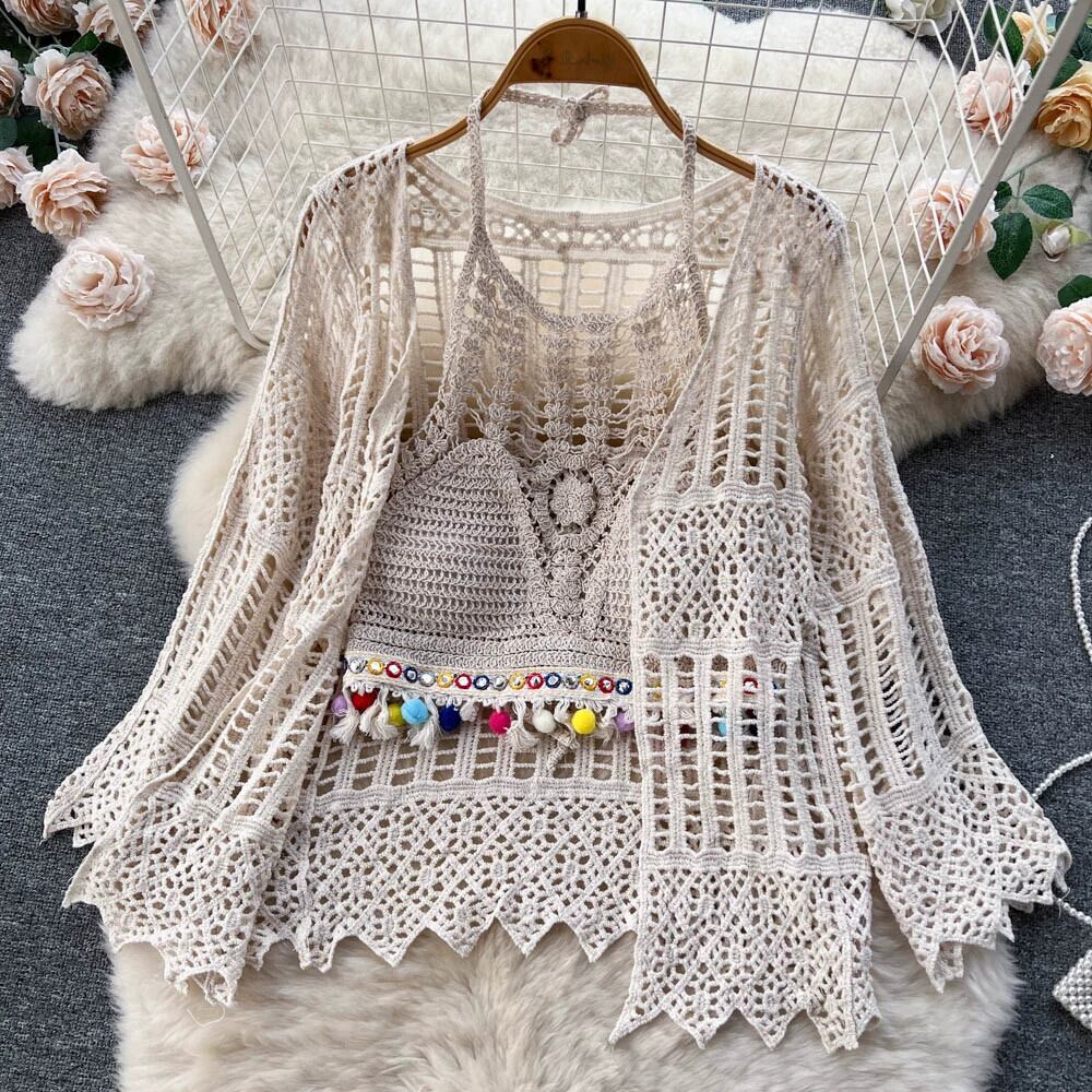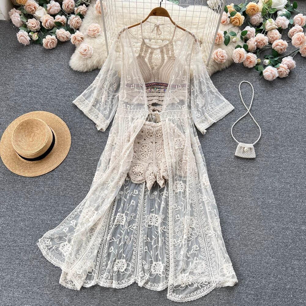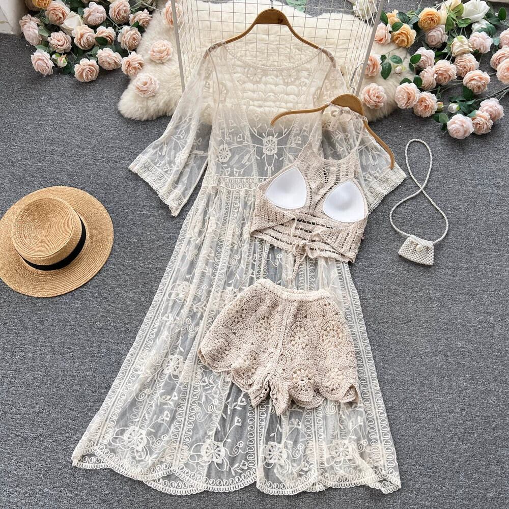 春夏ホリデースタイルレース刺繍ルーズロングショール+編み込みホルターネックチューブトップ+中空ショーツスリーピーススーツ レッド スプリング 春物 サマー 夏物 ブルマー jie98783944363