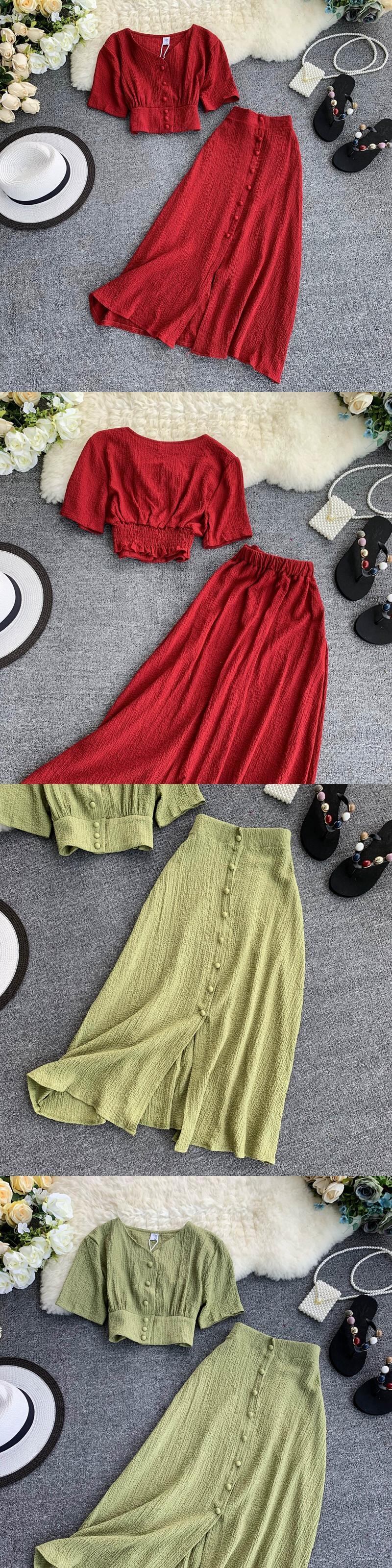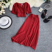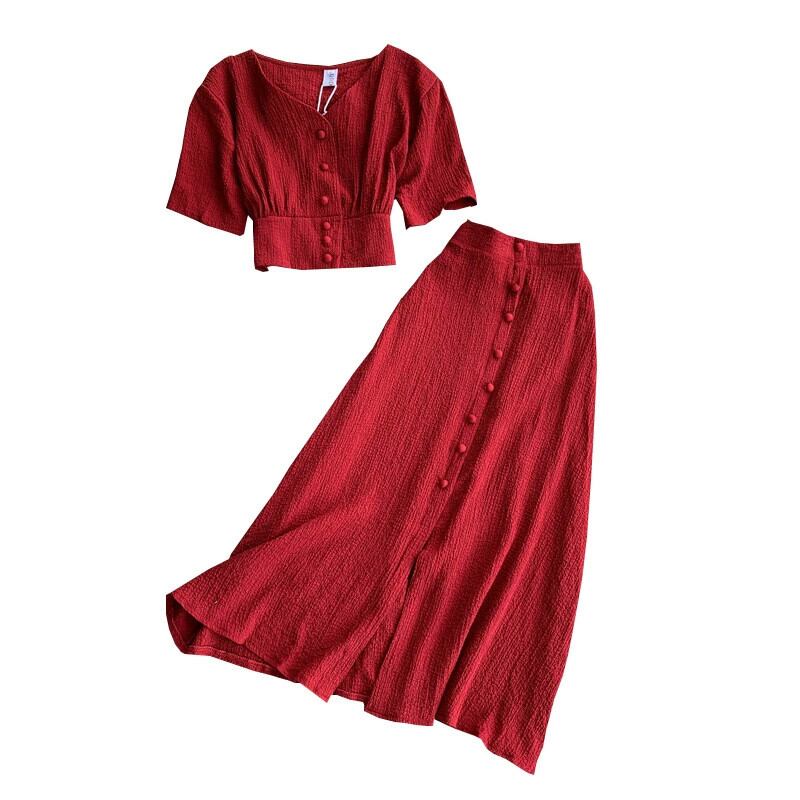 ネットセレブファッションスーツ無地シンプルシングルブレスト半袖クロップトップ弾性ウエストスカート2点セット エラスティック 伸縮 ソリッドカラー jie87493422758