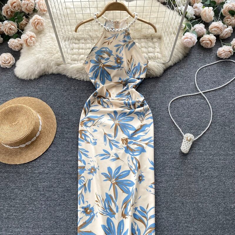 セレブライクな大人風高級パールホルターネックライトラグジュアリースリムヒップカバースリムドレスフェミニンスリットロングスカート 真珠 jie67170507223
