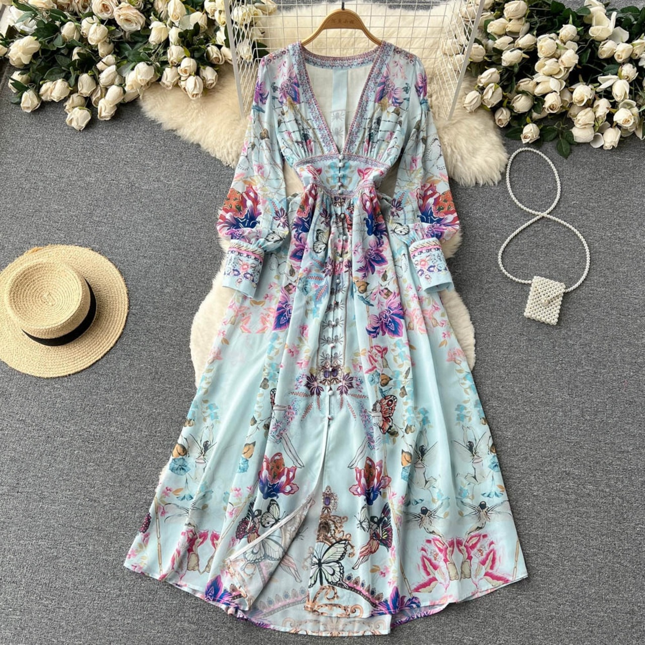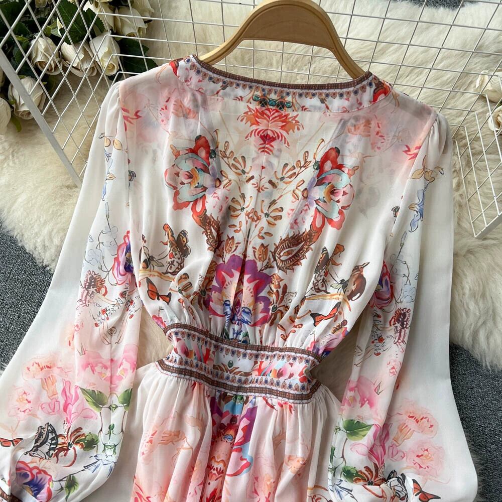 春の深い V ネック長袖プリントドレス女性、甘い気質、シフォンウエスト、ワイドスリット、ルーズスリット妖精スカート ロング 大人ガーリー スウィート キュート カジュアル スプリング 春物 Vネック jie80530295104