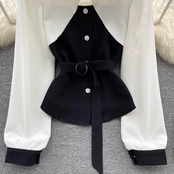 フランスの社交界の気質ニッチデザイン対照的なフェイクツーピース長袖シャツトップ秋の女性のシックな小さなシャツ ロング オータム 秋物 jie42705119097