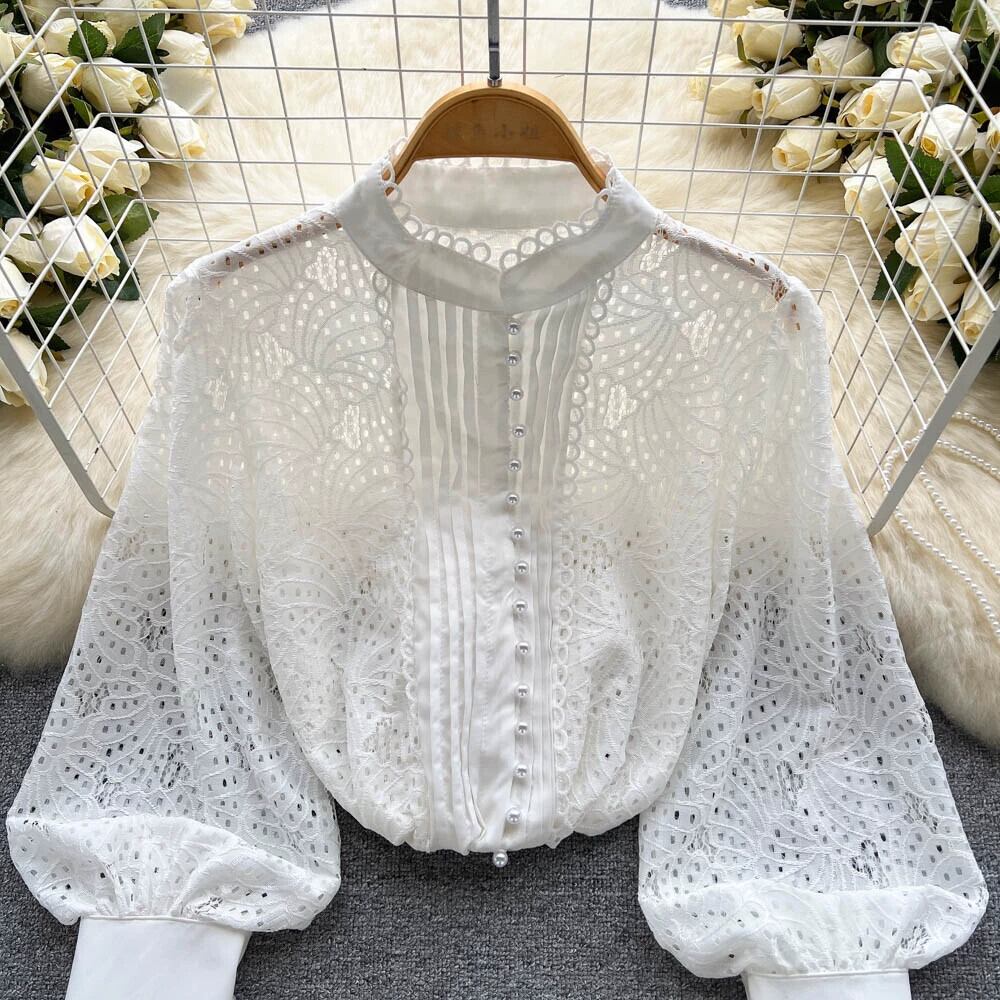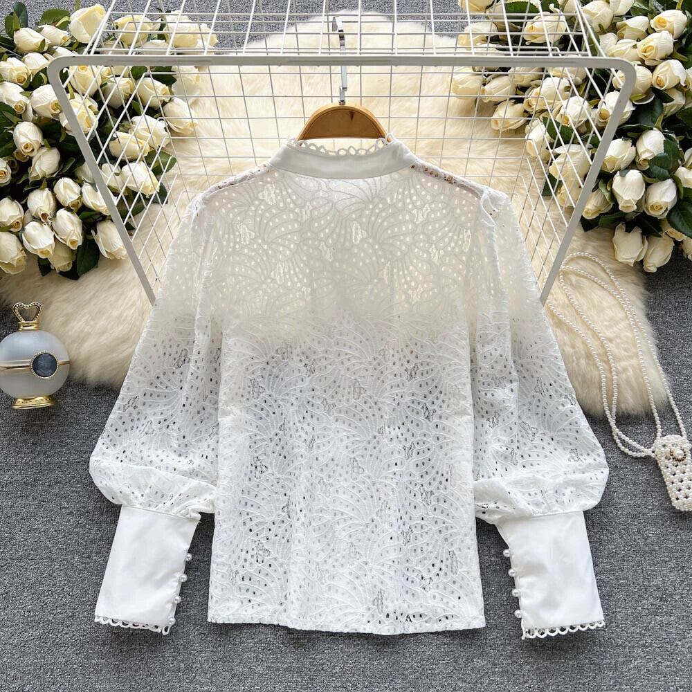 今年の人気の気質長袖中空レーストップレディース夏のファッションファッショナブルなeignスタイルカードウエスト小さなシャツトレンド ロング サマー 夏物 jie19946663742