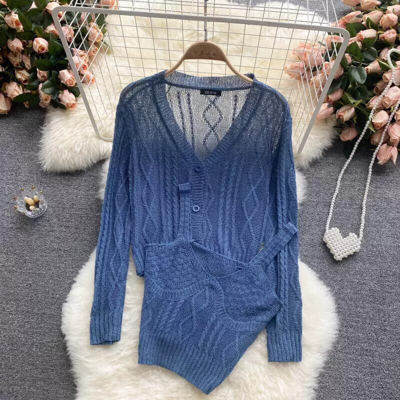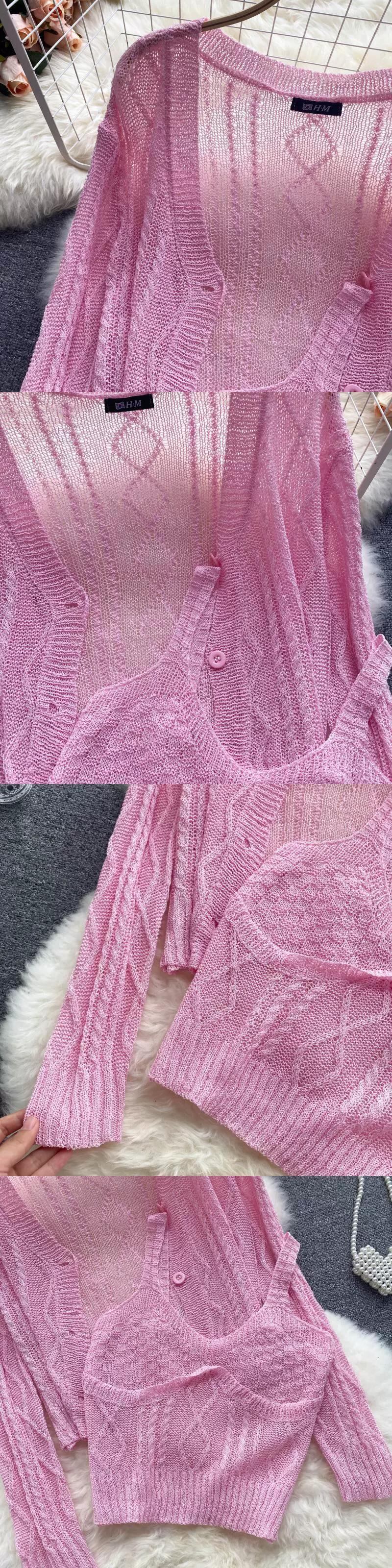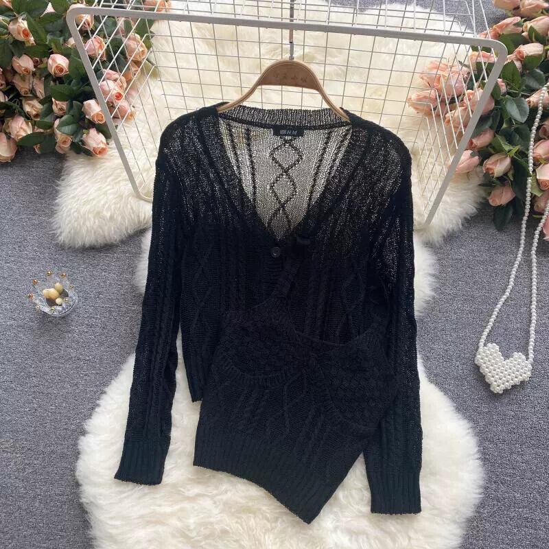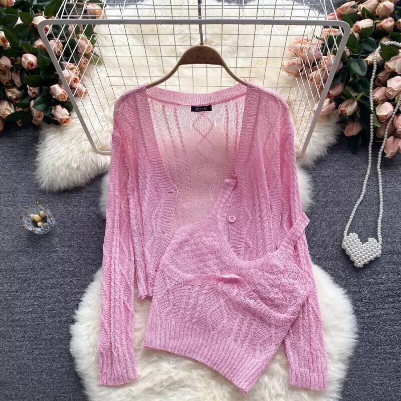 夏のレディース新作2022人気キャミソールレディースインナーショートトップス長袖ニットカーディガン2点セット ロング サマー 夏物 jie38315157469
