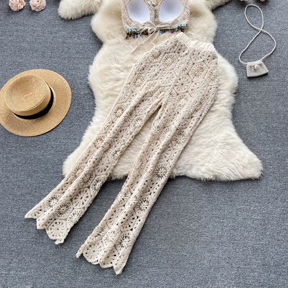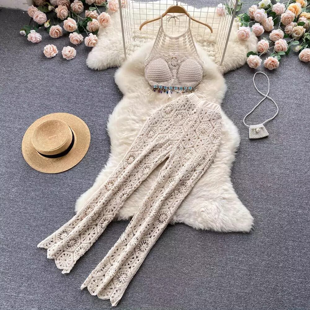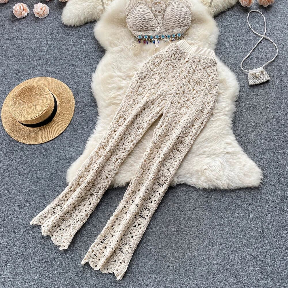 トラベルポグラフィーバケーションインスタイル純粋な欲望セクシーなサスペンダーホルタートップ女性のサマースーツハイウエスト中空ズボンツーピースセット 夏物 ピュア jie10846060837