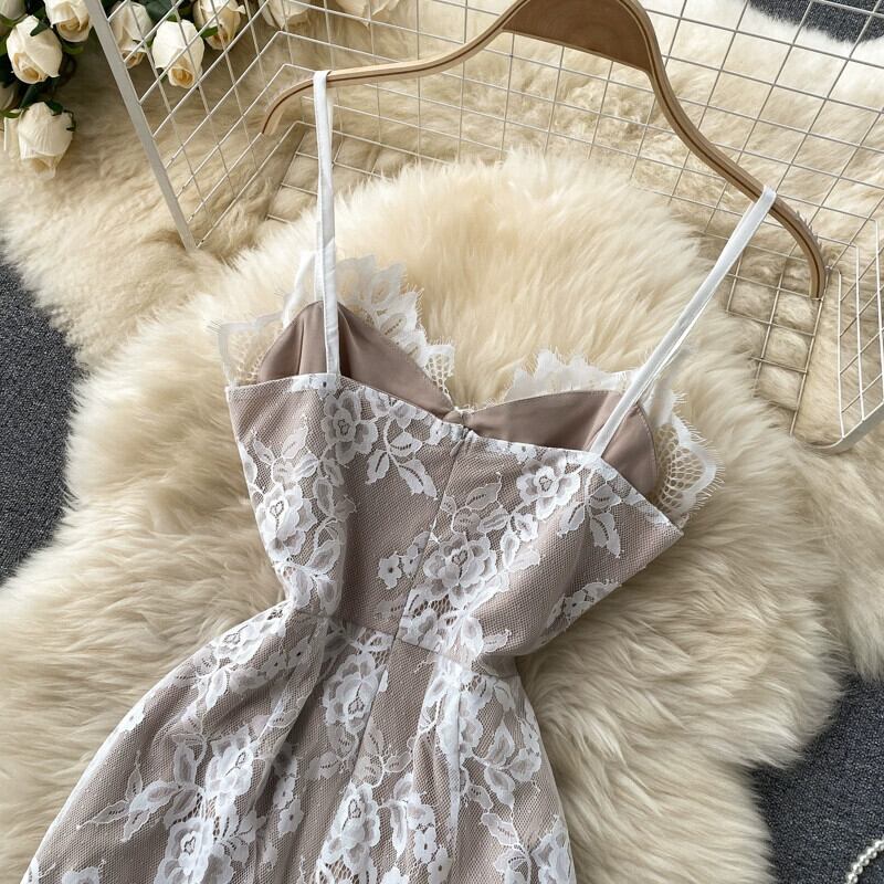 フェミニンドレスニッチ人気デザイン波状エッジレーススリムフィットミッドレングスセクシーサスペンダースカートトレンディ jie4024639374