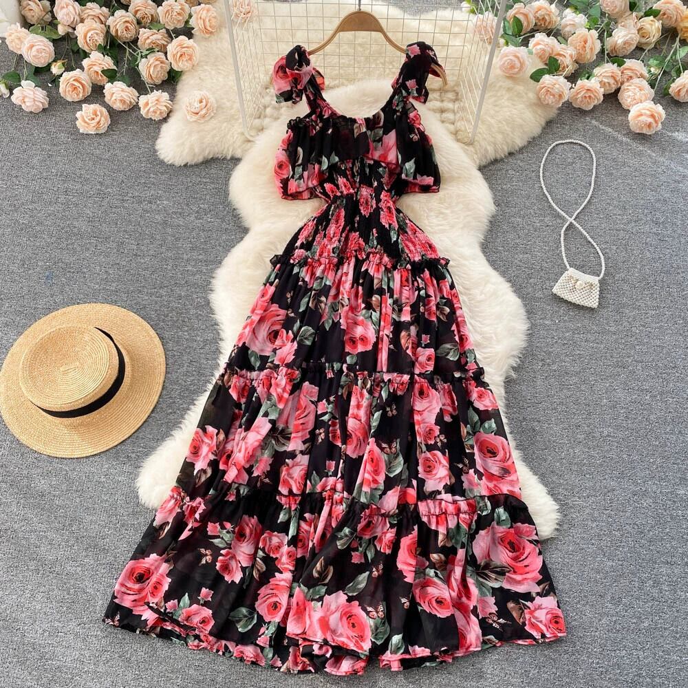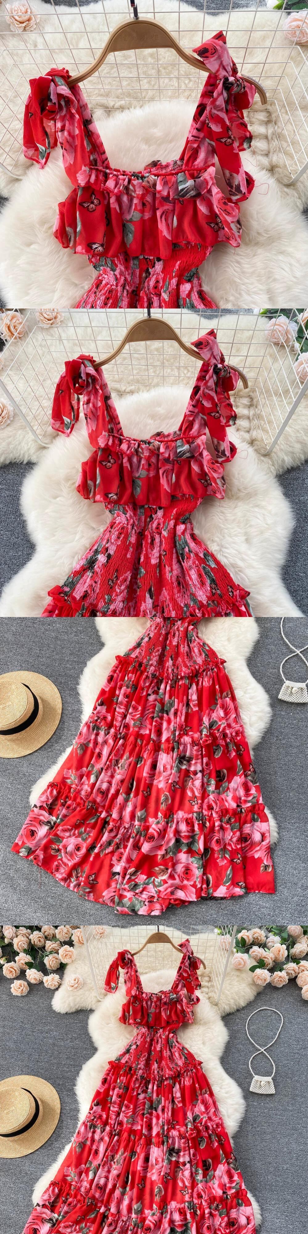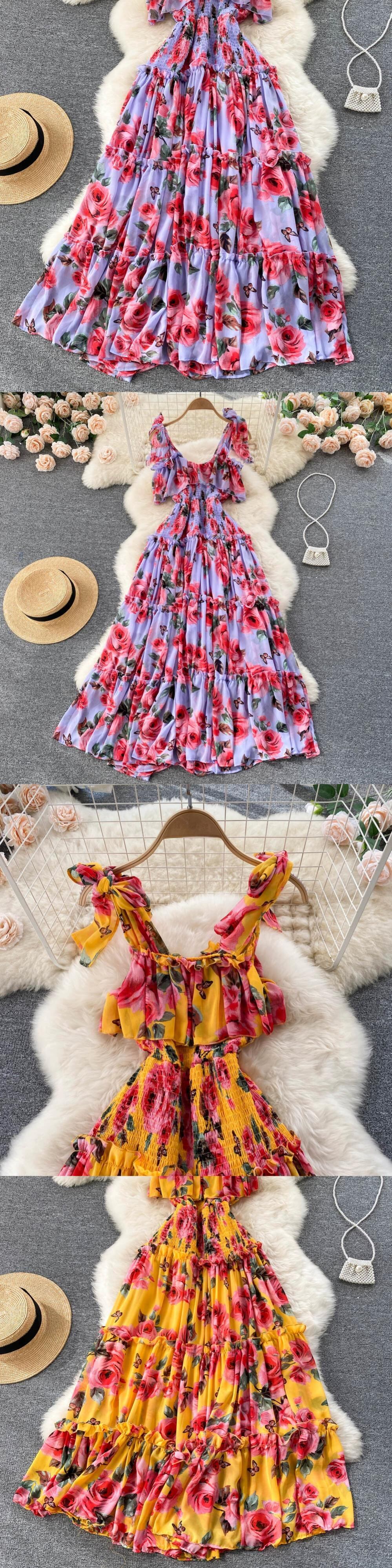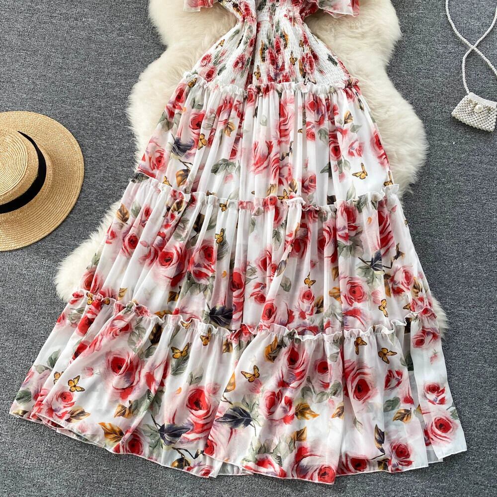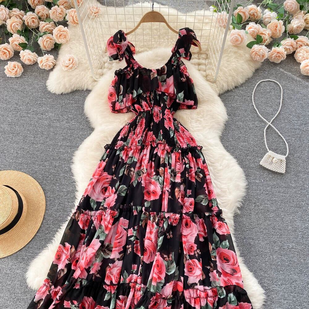 2022 ビーチスカート女性痩身海辺リゾートスタイルニーハイプリーツロングスカートスーパー妖精シフォンプリントドレス jie17580717869