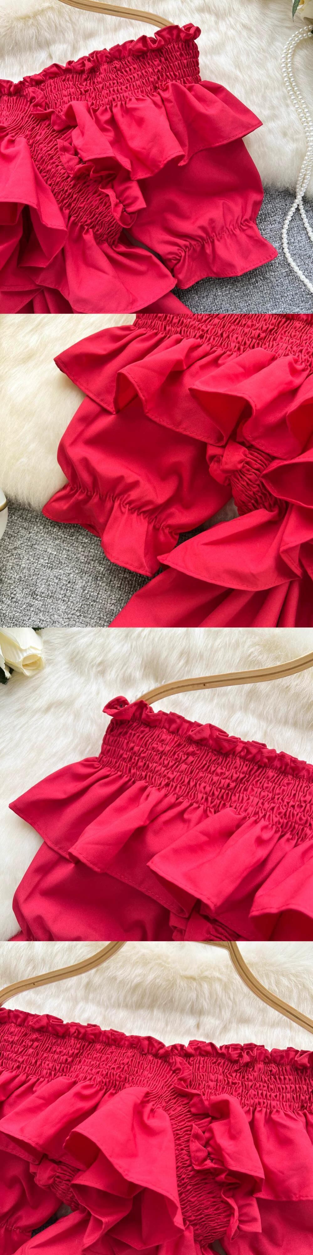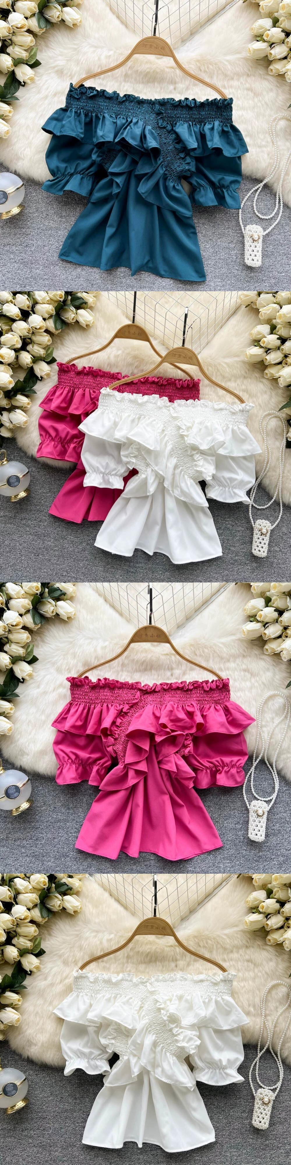 シックで甘いキノコエッジの鎖骨ワンショルダーフリルパフ半袖トップショートシックシャツ 大人ガーリー スウィート キュート カジュアル jie88194498739