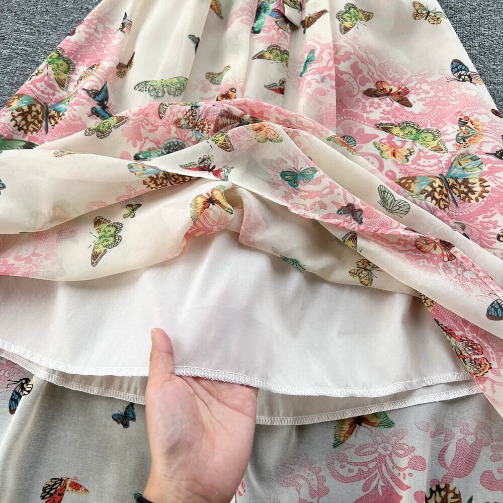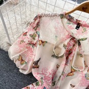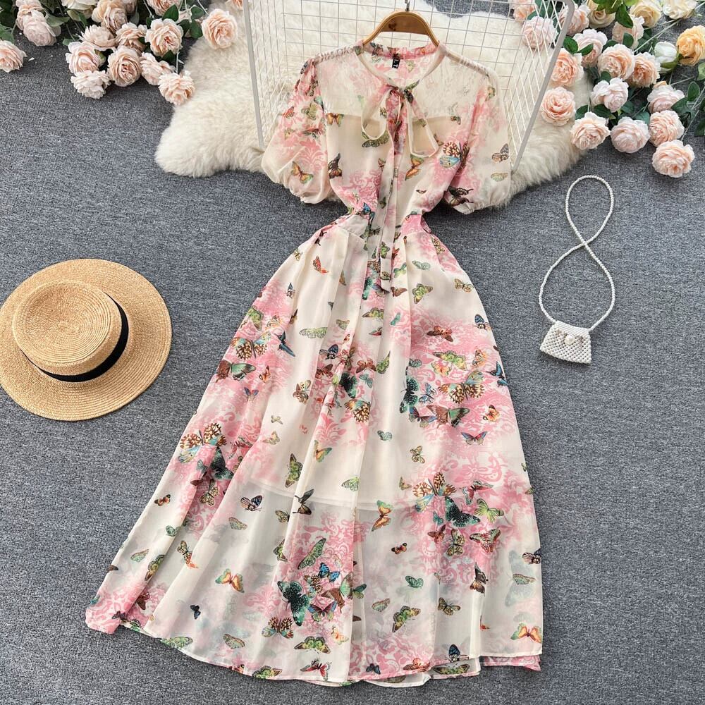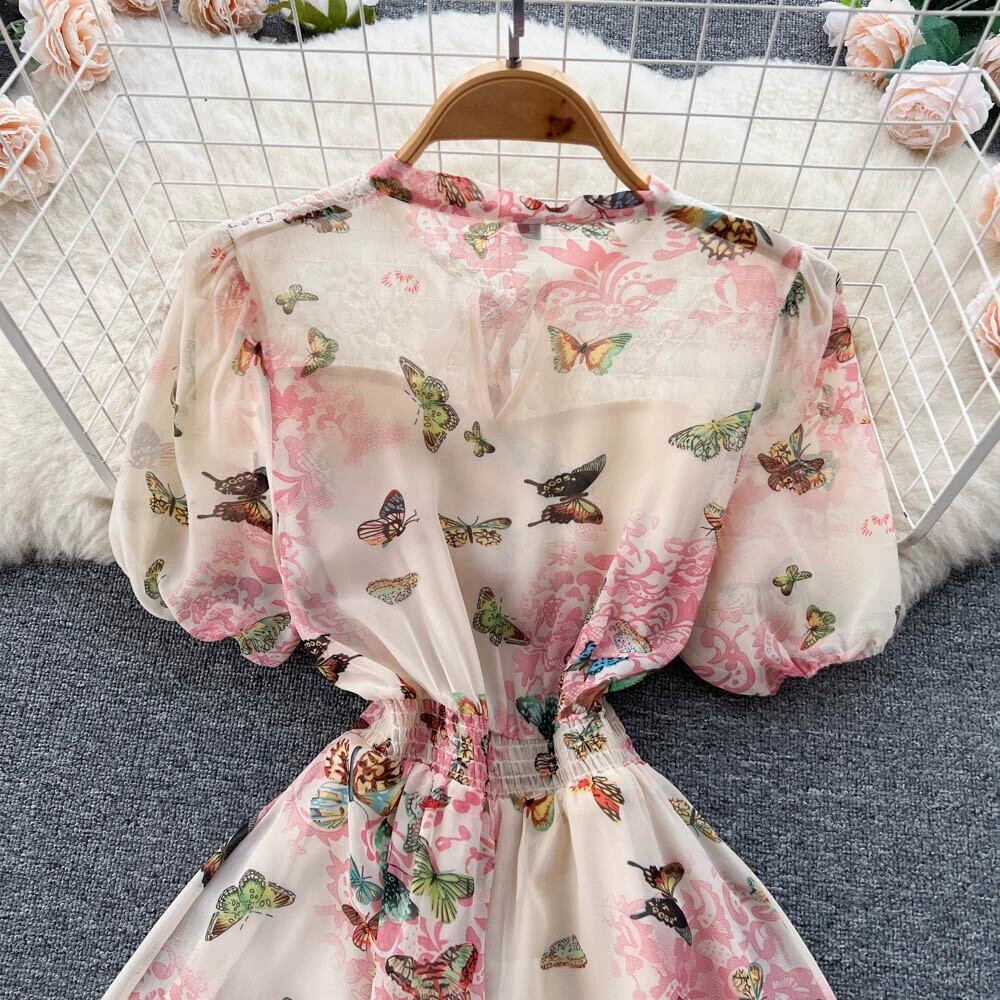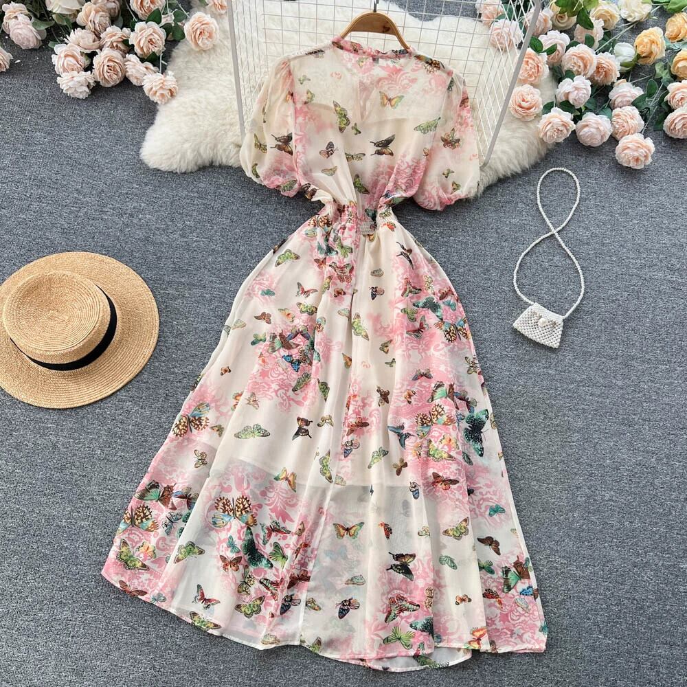 フレンチスイートパフスリーブドレス夏の新しい小花柄ロングスカート女性のウエスト甘くてスパイシーなスカート 大人ガーリー スウィート キュート カジュアル サマー 夏物 jie15454972546