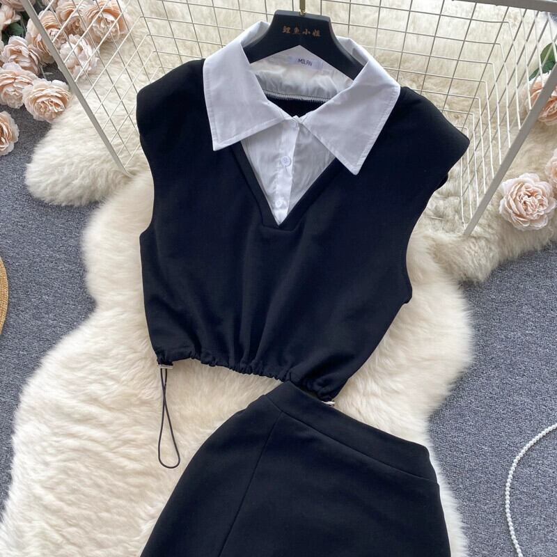 カジュアルスーツの女性の夏のショートラペルノースリーブトップハイウエストバッグヒップスリットハーフレングススカート2点セット ハイウェスト サマー 夏物 jie59672986992