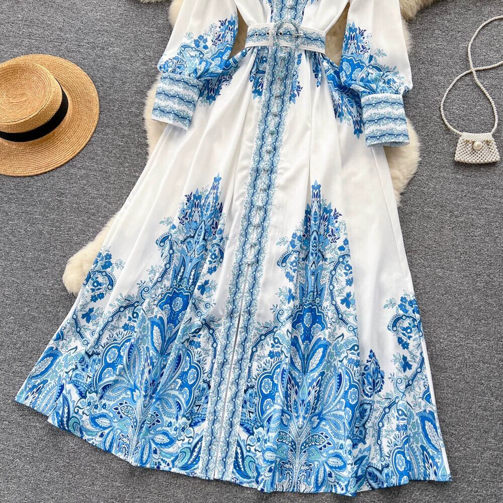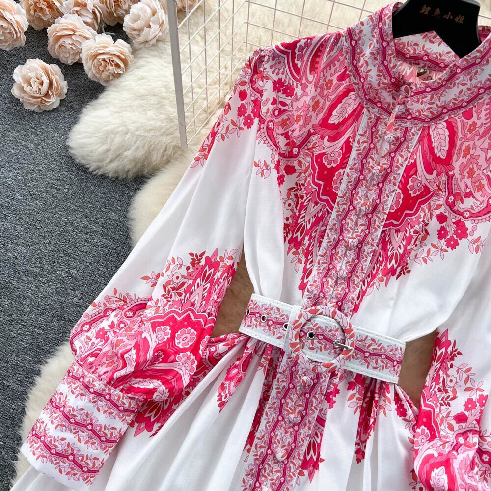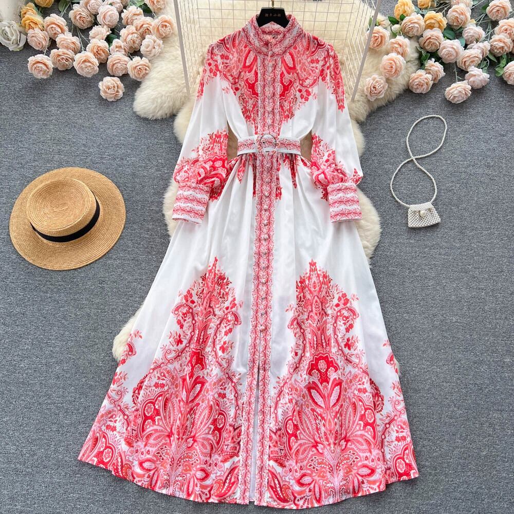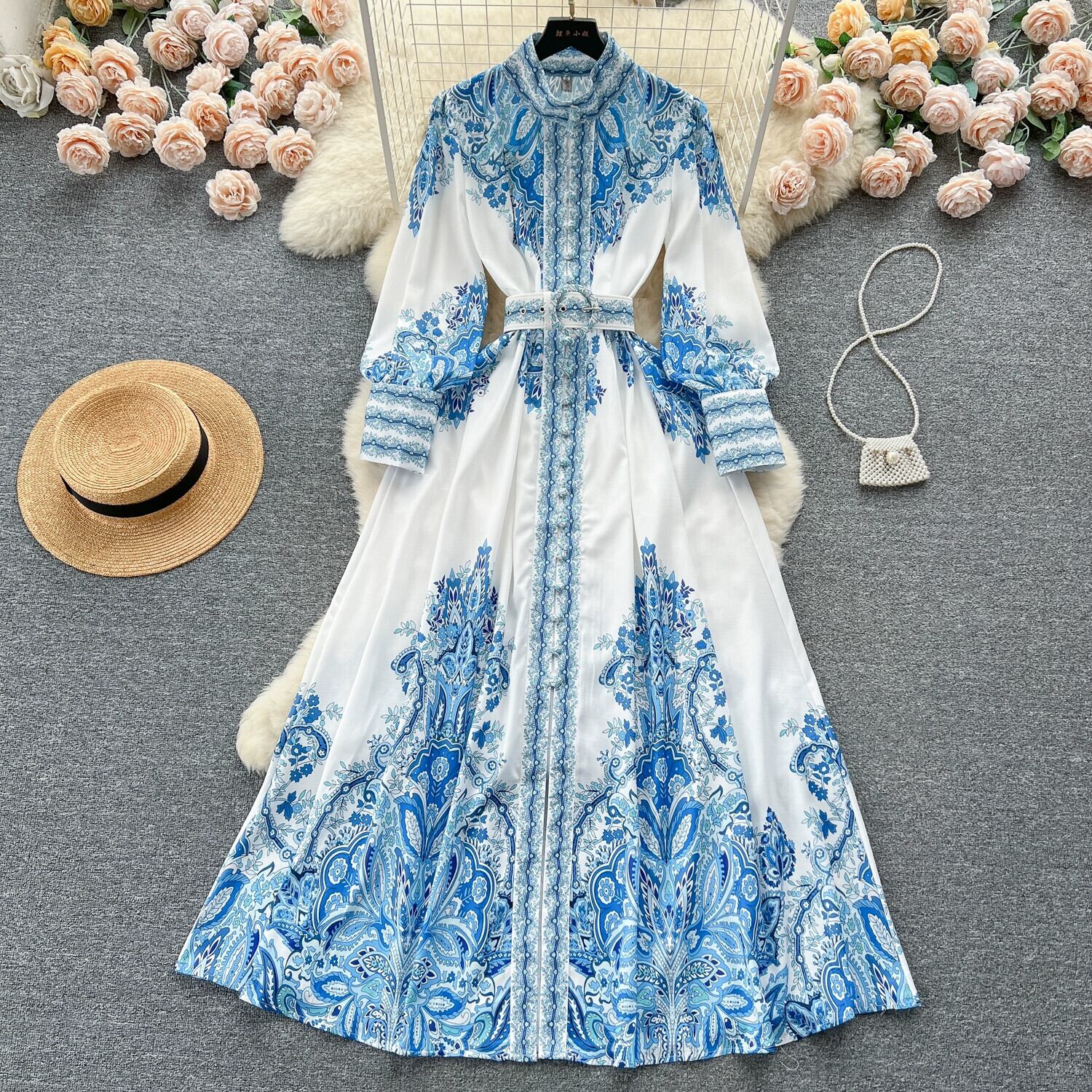フランスのレトロな宮殿スタイルのハイエンドのスタンドカラー シングルブレスト、ウエストを細くする大きな裾の A ライン プリント ドレス レース Aライン jie88149255515