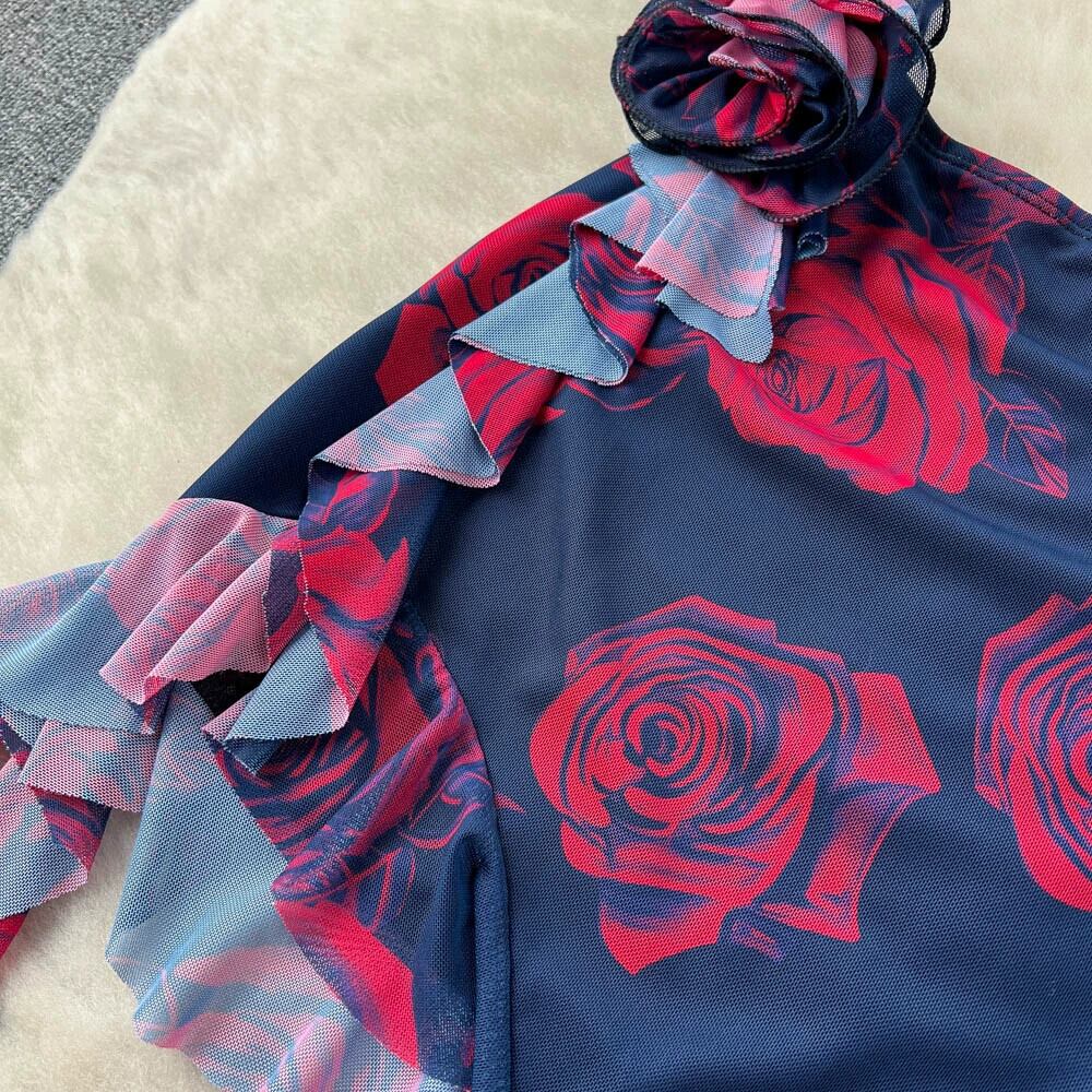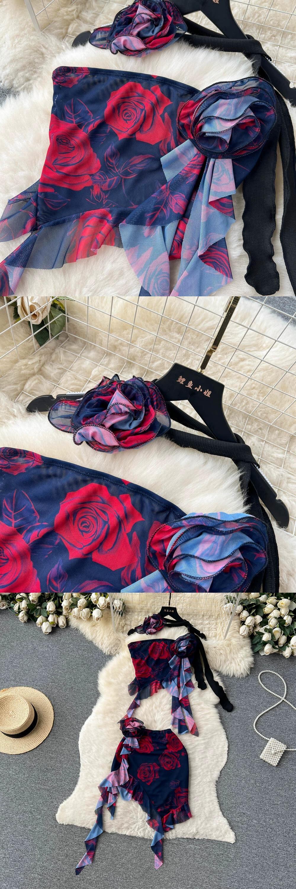 フレンチ ホリデー ネクタイ スーツ レディース、薄い花柄リボン メッシュ プリント、胸巻き、イレギュラー スカート、2 点セット jie50994209796