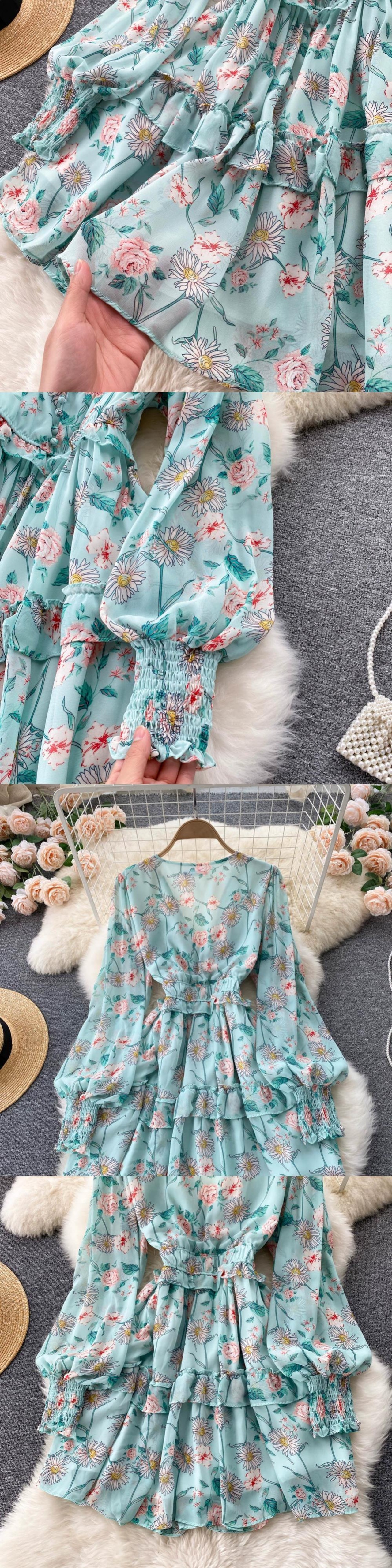 秋の婦人服 2022 新しいフレンチスタイル V ネックハイウエスト痩身エレガントなプリントフリル妖精スカート ハイウェスト オータム 秋物 Vネック jie92838463683