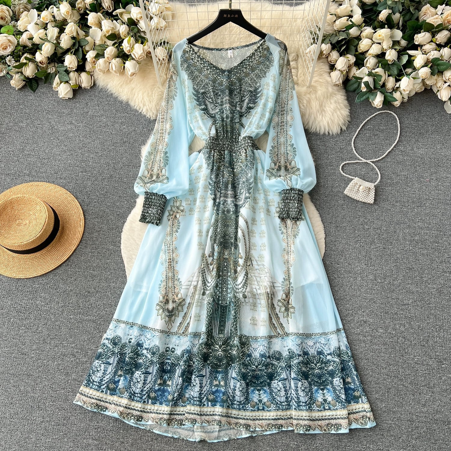 夏薄いフレンチレトロファッションハイエンドランタン長袖プリントドレス女性のウエストを締める気質大きなスイングスカート ロング サマー 夏物 jie65527253171