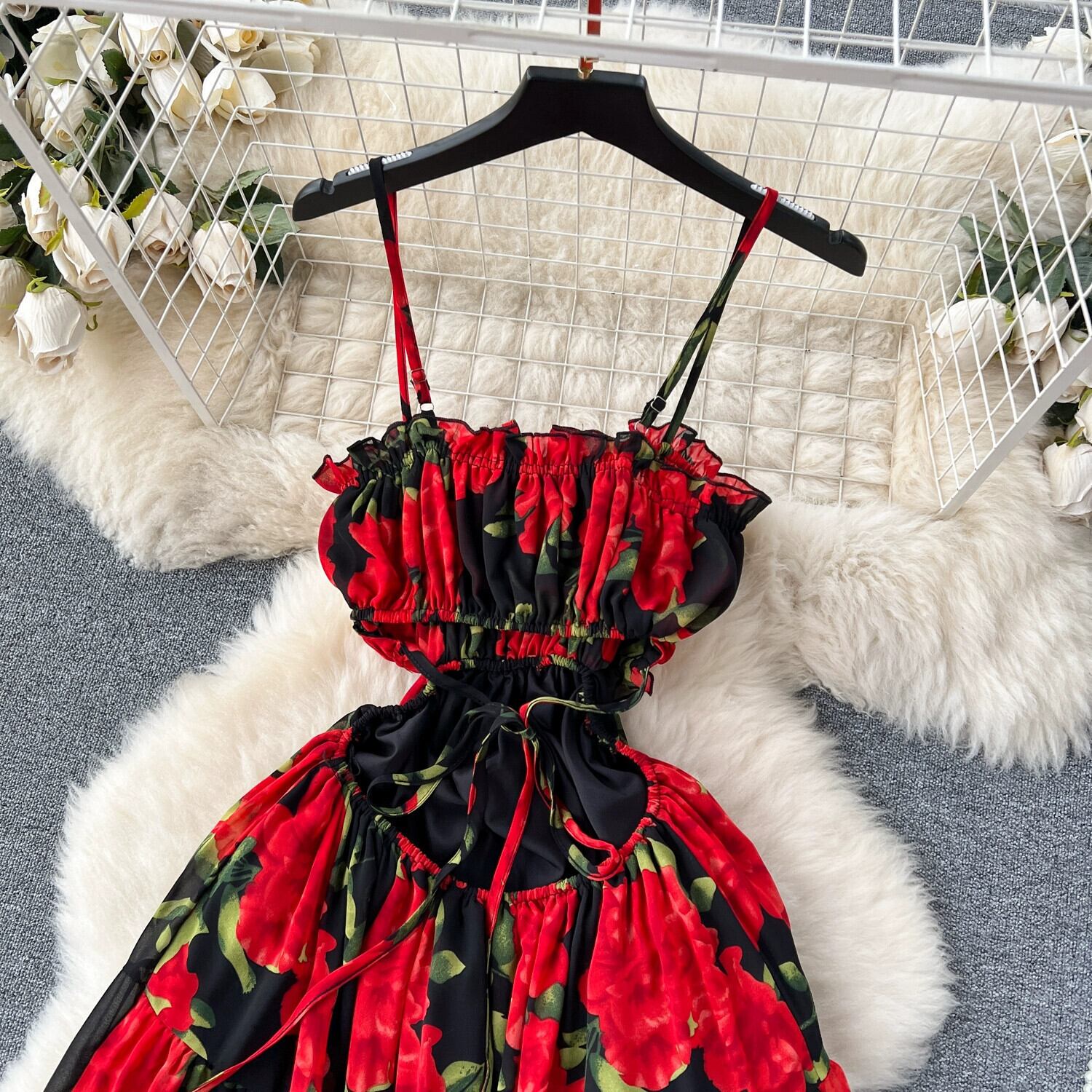 フレンチレトロスタイルの花柄サスペンダードレスレディース、サマープリーツウエスト露出デザイン、フルヘムの美しくユニークなロングスカート 夏物 jie51408905271