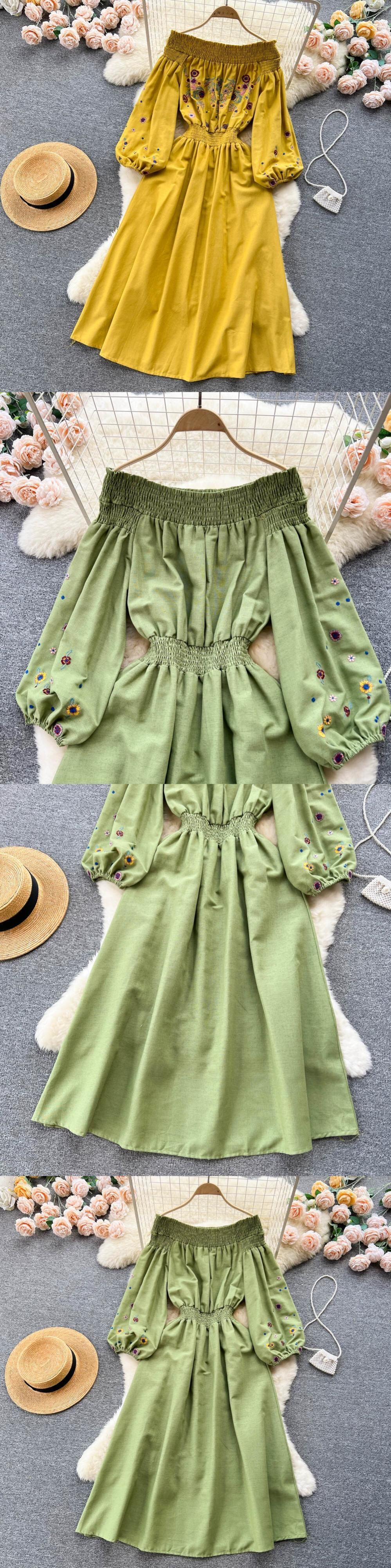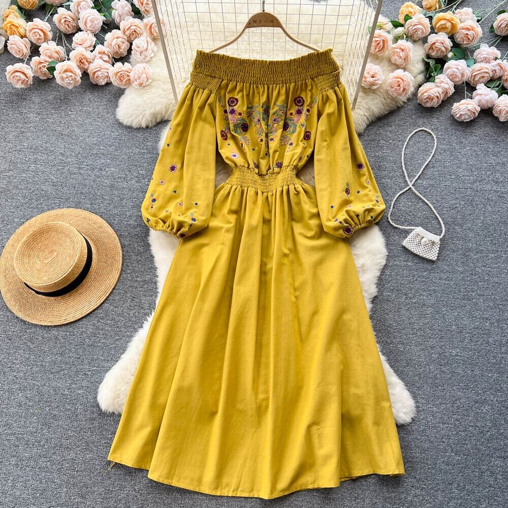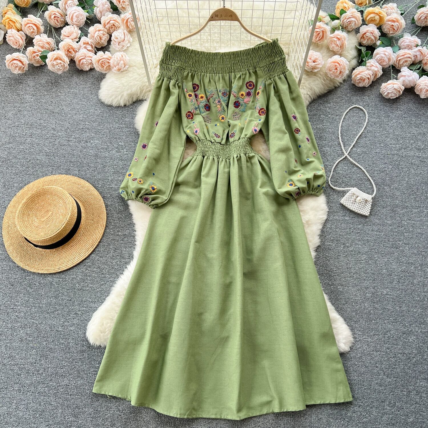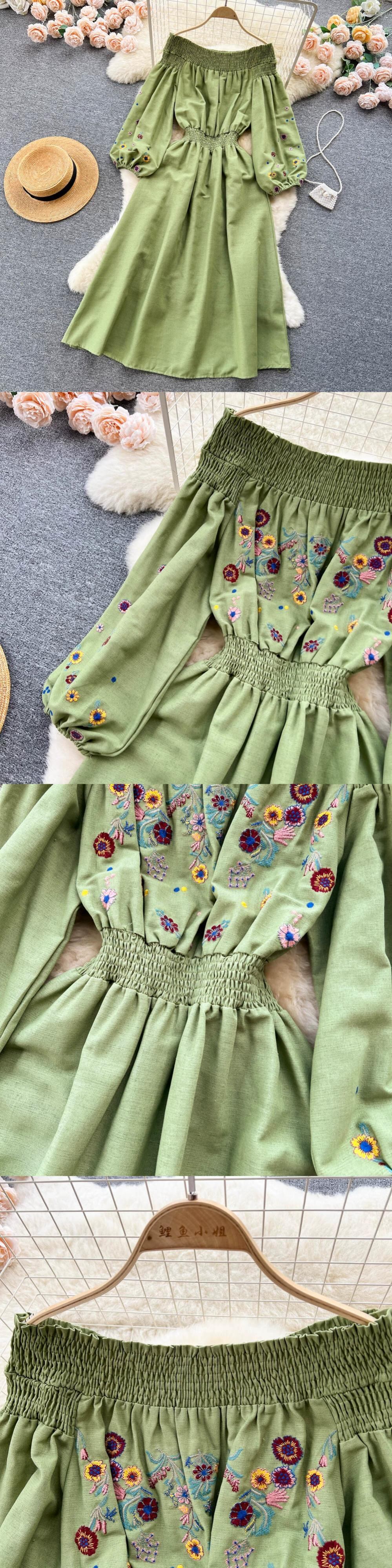 レトロなワンラインカラードレスレディース春夏、重厚な刺繍、プリーツウエストデザイン、ランタンスリーブ、ワイドスカート スプリング 春物 サマー 夏物 jie35632023426