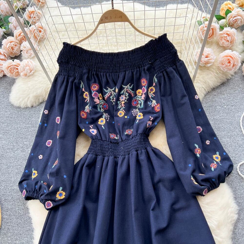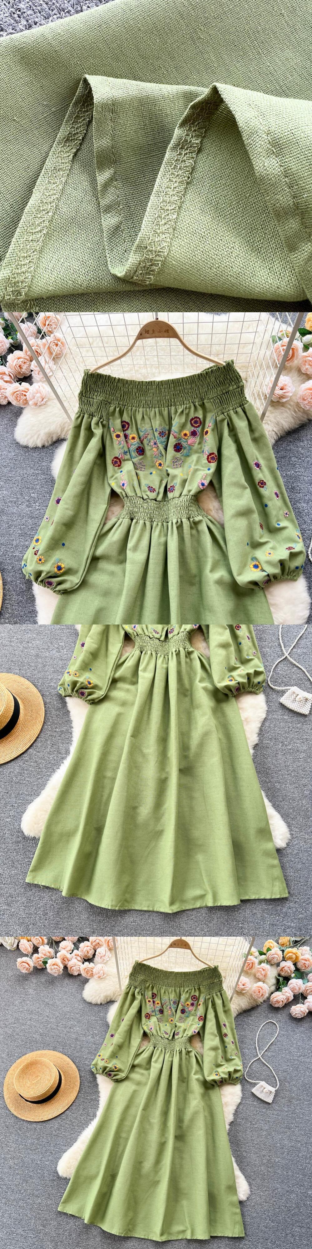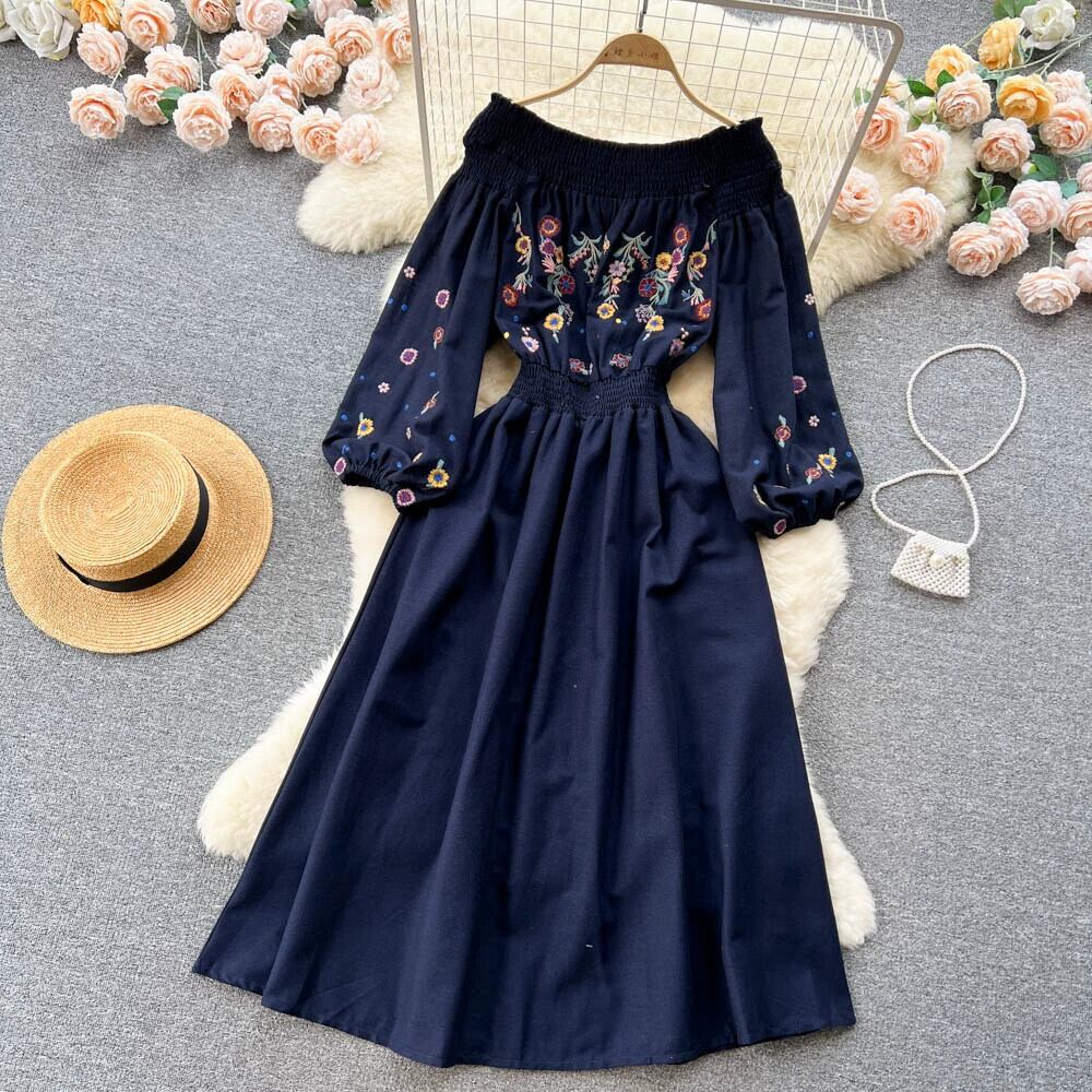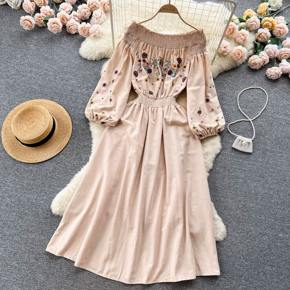 レトロなワンラインカラードレスレディース春夏、重厚な刺繍、プリーツウエストデザイン、ランタンスリーブ、ワイドスカート スプリング 春物 サマー 夏物 jie35632023426