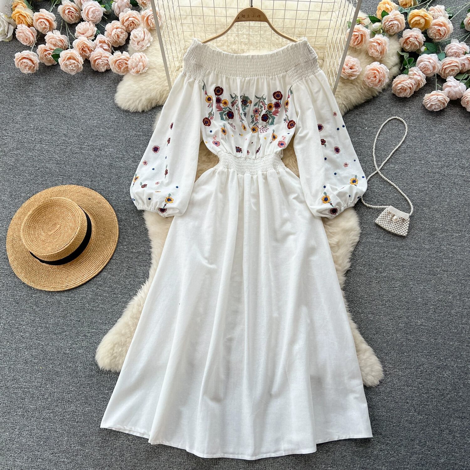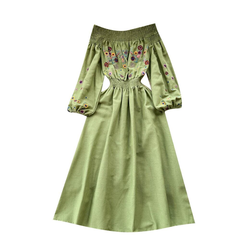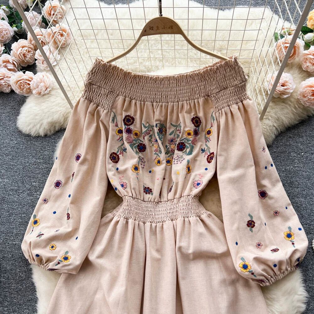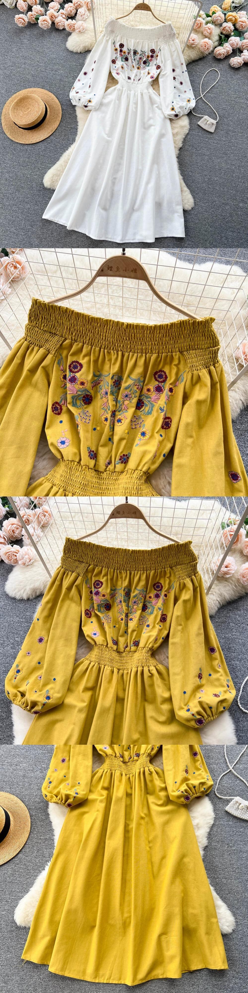 レトロなワンラインカラードレスレディース春夏、重厚な刺繍、プリーツウエストデザイン、ランタンスリーブ、ワイドスカート スプリング 春物 サマー 夏物 jie35632023426